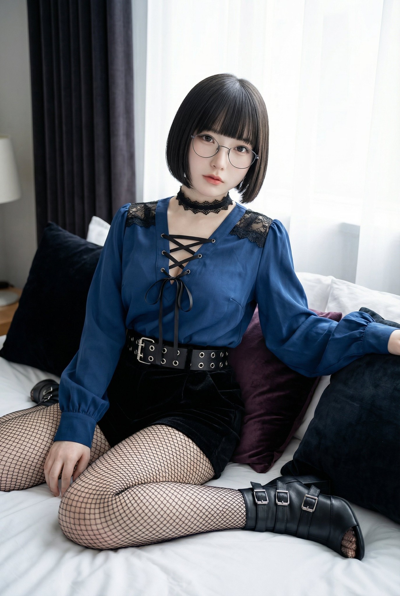 CopyDeep blue bishop sleeve blouse featuring a deep V-neckline, black lace shoulder trim, and criss-cross black ribbon lace-up chest tied in a bow, tucked into high-waisted black velvet shorts. Styled with a wide black leather grommet belt with a silver double-prong buckle, a black lace choker, black fishnet tights, and black leather multi-strap open-toe ankle boots with silver buckles.