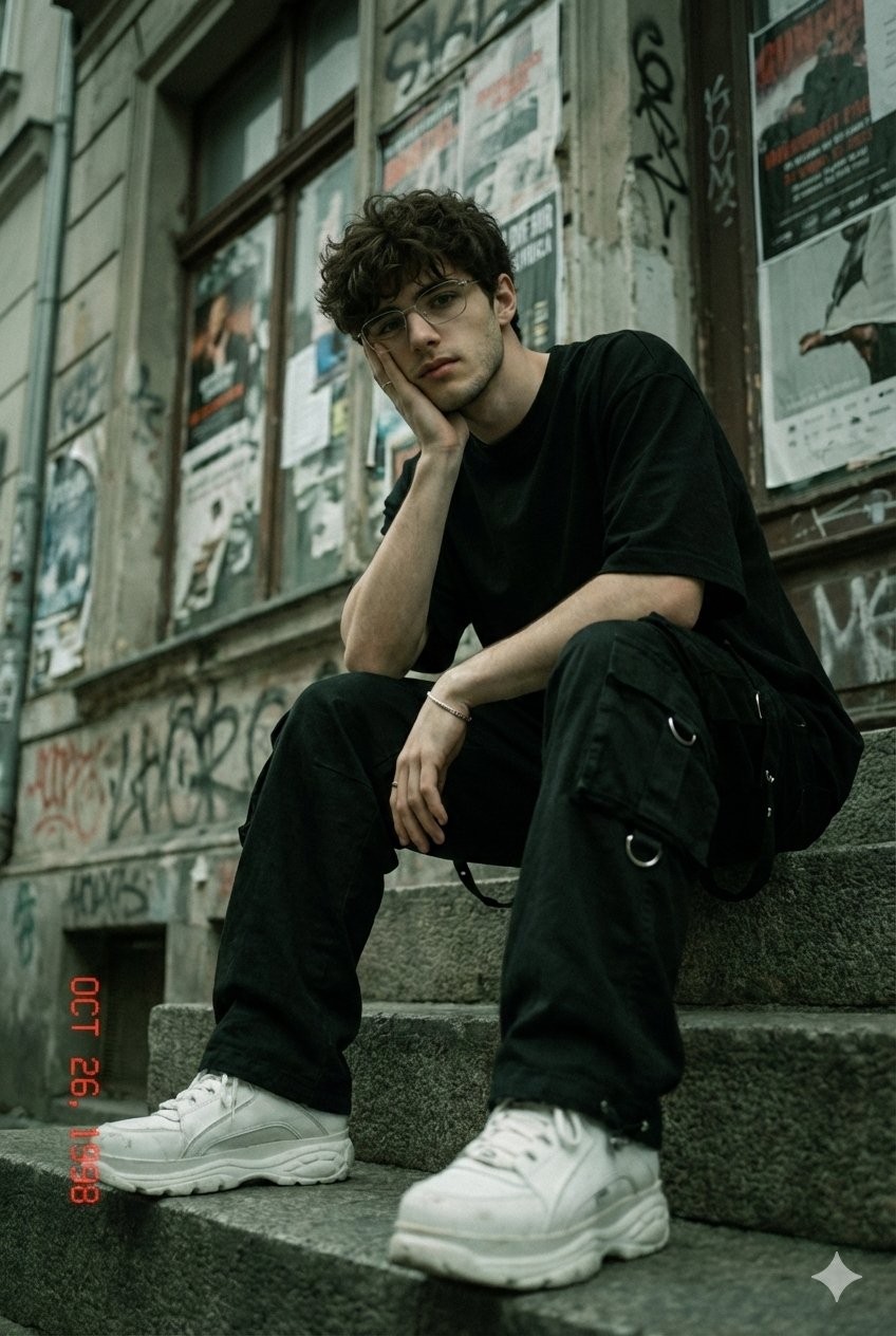 CopyA young man sitting on old concrete steps in front of a worn-out, grunge-style building covered in faded posters and graffiti. He wears an oversized black t-shirt, loose black cargo pants with metal loops, and chunky white sneakers. He rests his cheek on his left hand with a bored, effortless expression. Minimal silver jewelry — thin bracelet, small rings. The pose should feel relaxed, slightly slouched, capturing a "too cool to care" attitude. Shoot from a lower angle to make him appear confident and aesthetic. Lighting should be low-contrast, moody, and cinematic. Apply a retro film-style filter with a slight greenish tint, soft grain texture, and desaturated tones. Include a red digital date stamp on the lower left corner like an old camcorder.