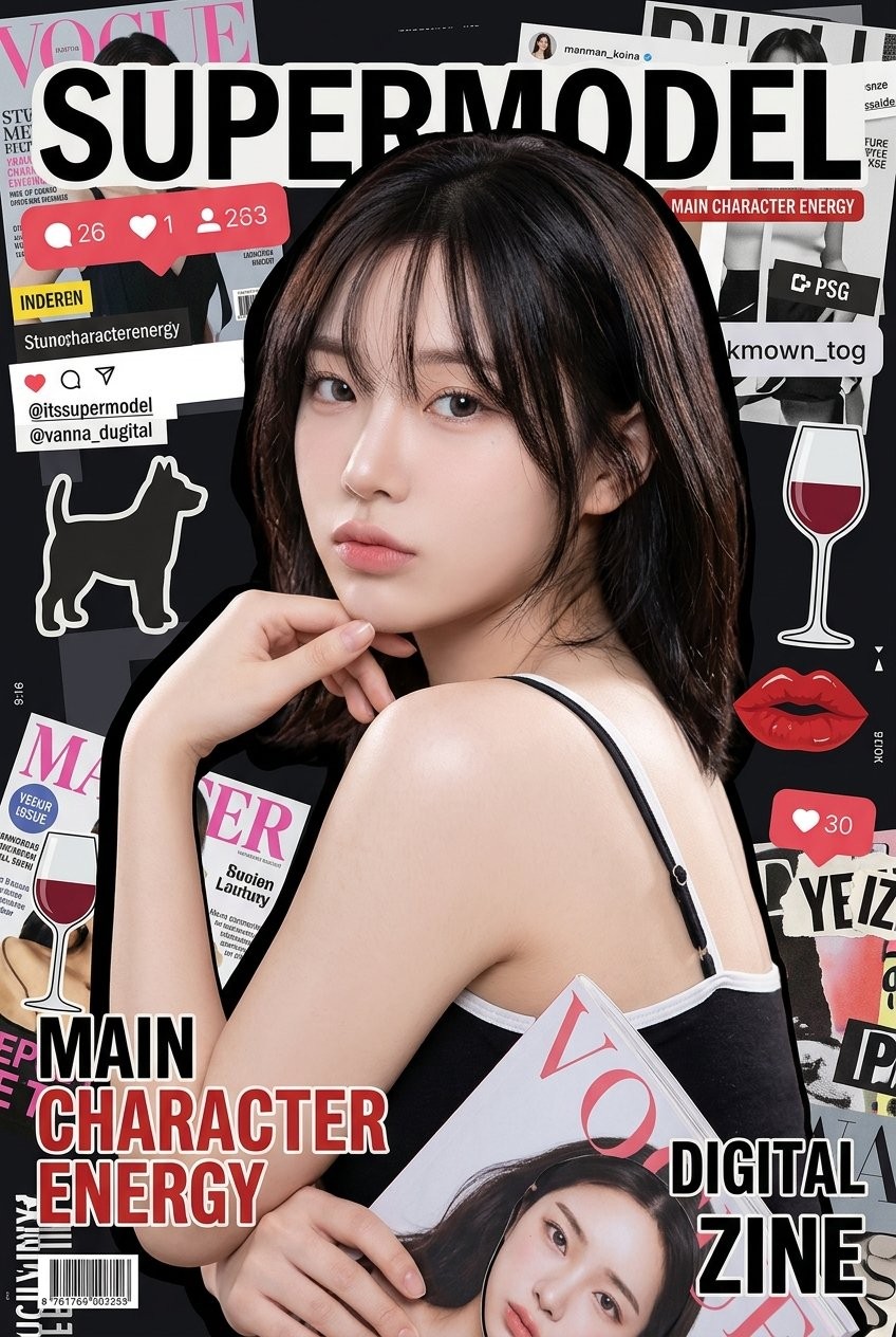 Copy{ "subject": { "description": "Young female centered in a stylized digital scrapbook collage.", "age": "late teens to early 20s", "expression": {"eyes": {"look": "direct", "energy": "soft, alluring", "direction": "at camera"}, "mouth": {"position": "slight pout", "energy": "relaxed"}, "overall": "effortlessly confident"}, "face": {"preserve_original": true, "makeup": "East Asian pop-idol aesthetic, glass skin, glossy peach lips, soft blush, defined but natural brows."} }, "hair": {"color": "dark brown to black", "style": "loose, face-framing wispy bangs", "effect": "soft sheen, slightly tousled"}, "body": {"frame": "slender", "skin": {"visible_areas": "shoulders, upper arms, back side, hands", "tone": "fair, pale", "texture": "smooth, soft, moisturized feel"}}, "pose": {"position": "torso turned away, looking back over shoulder", "base": "waist up", "overall": "left hand resting lightly under chin, right arm holding a magazine prop"}, "clothing": {"top": {"type": "camisole or stylized top", "color": "black with white trim", "details": "thin straps, contrasting edge"}}, "accessories": {"prop": "held magazine featuring a face cutout"}, "photography": { "camera_style": "digital portrait heavily manipulated into a graphic design layout", "angle": "eye-level", "shot_type": "medium close-up", "aspect_ratio": "9:16", "texture": "clean photographic subject contrasting with flat vector graphics and distressed text", "lighting": "soft studio portrait lighting on subject, flat artificial light on graphics", "depth_of_field": "sharp focus on subject, flat 2D graphic background" }, "background": { "setting": "digital collage workspace", "wall_color": "dark/black base", "elements": ["social media UI overlays", "bold typography like 'Supermodel'", "magazine cutouts", "dog silhouette", "wine glass graphic", "floating red lips"], "atmosphere": "chaotic, trendy, scrapbook style" }, "the_vibe": { "energy": "pop-culture, trendy", "mood": "playful, curated narcissism", "aesthetic": "Y2K scrapbook, digital zine cover", "story": "a digital magazine cover highlighting a rising star" } }