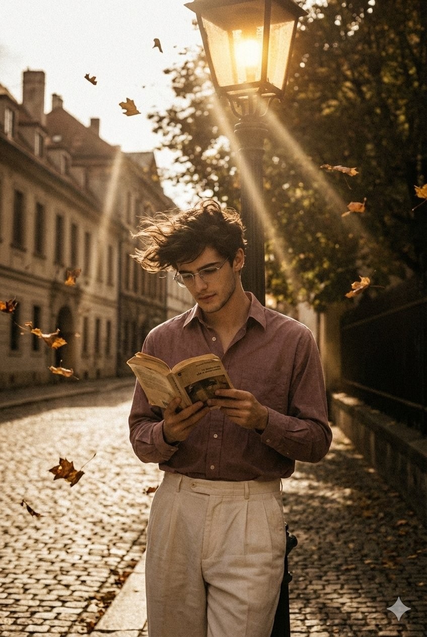 CopyCreate a retro, vintage-inspired image - grainy yet bright with little sun rays based on the reference picture. The boy should be wearing a light maroon shirt, paired with plated off-white pants styled in a Pinterest-inspired aesthetic. The vibe must capture the essence of a 90s movie dark-brown-haired baddie, hair waving by a windy, romantic atmosphere. Standing under the aesthetic street light and reading a book as a few leaves blow in the air, while dramatic contrasts add mystery and artistry to the scene, creating a moody yet enchanting atmosphere.