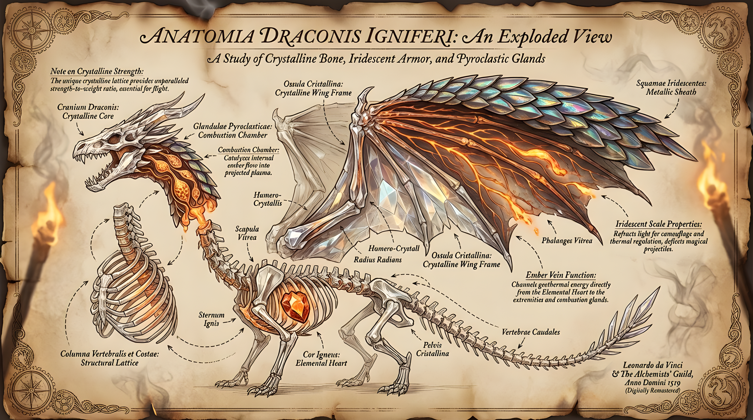 CopyCreate an exploded-view illustration of a dragon's anatomy, dissecting its wings, scales, fire-breathing glands, and skeletal structure into labeled components with connecting arrows. Each part is rendered in intricate detail, showing metallic iridescent scales, glowing ember veins, and crystalline bones. Set against a ancient parchment background with subtle smoke effects and warm torchlight shadows. Include educational annotations in elegant script font. Horizontal blueprint-style poster, fantasy realism, high-resolution, inspired by Leonardo da Vinci's sketches with a modern digital twist.
