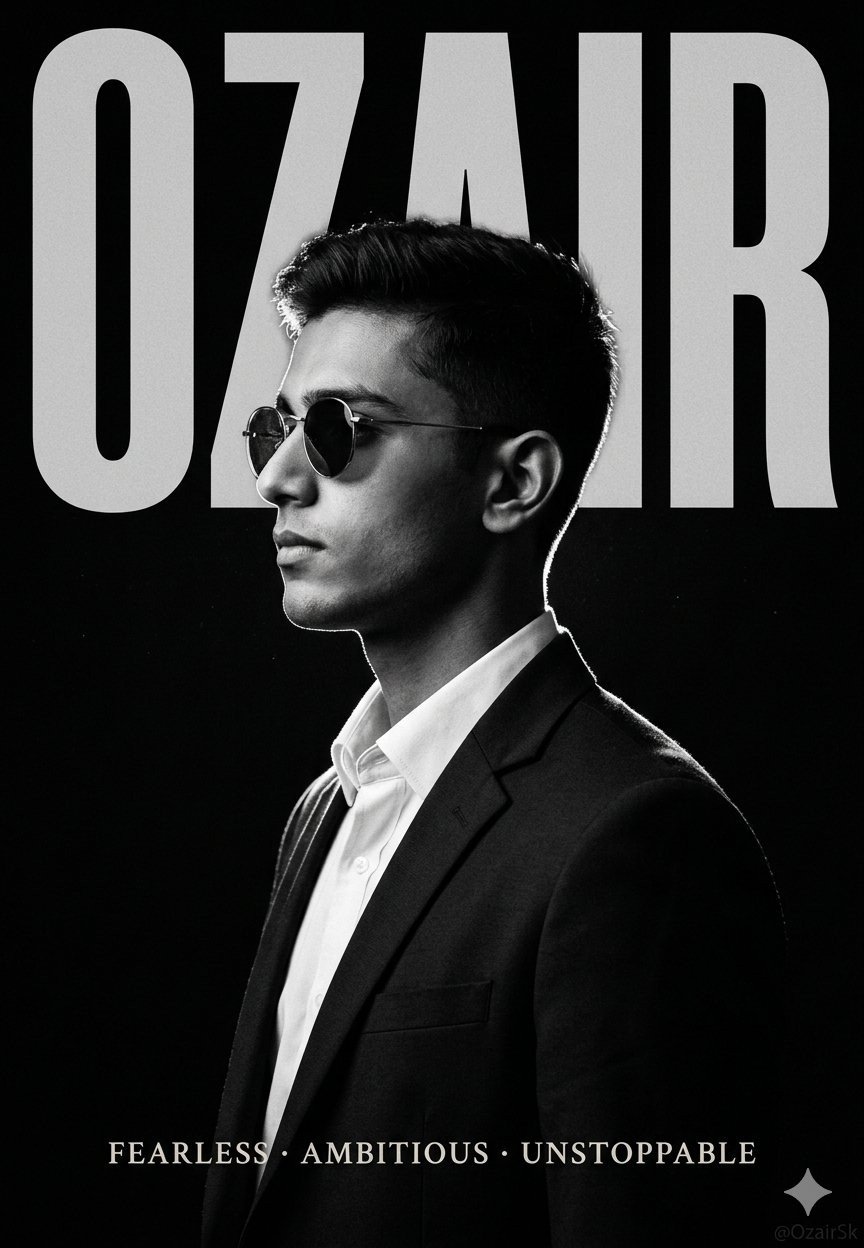 CopyA dramatic black and white cinematic portrait poster. A young South Asian man with sharp features, round sunglasses, and a clean blazer over a white shirt stands in sharp side profile against a pure black background. Rim lighting traces a crisp white glow along the jawline, ear, and shoulder edge. Behind him, massive bold condensed uppercase text reads "OZAIR" filling the entire upper frame. Below the figure, small elegant text reads "FEARLESS · AMBITIOUS · UNSTOPPABLE". Vertical 9:13 format. Ultra photorealistic, 8K, no text overlays, cinematic color grading