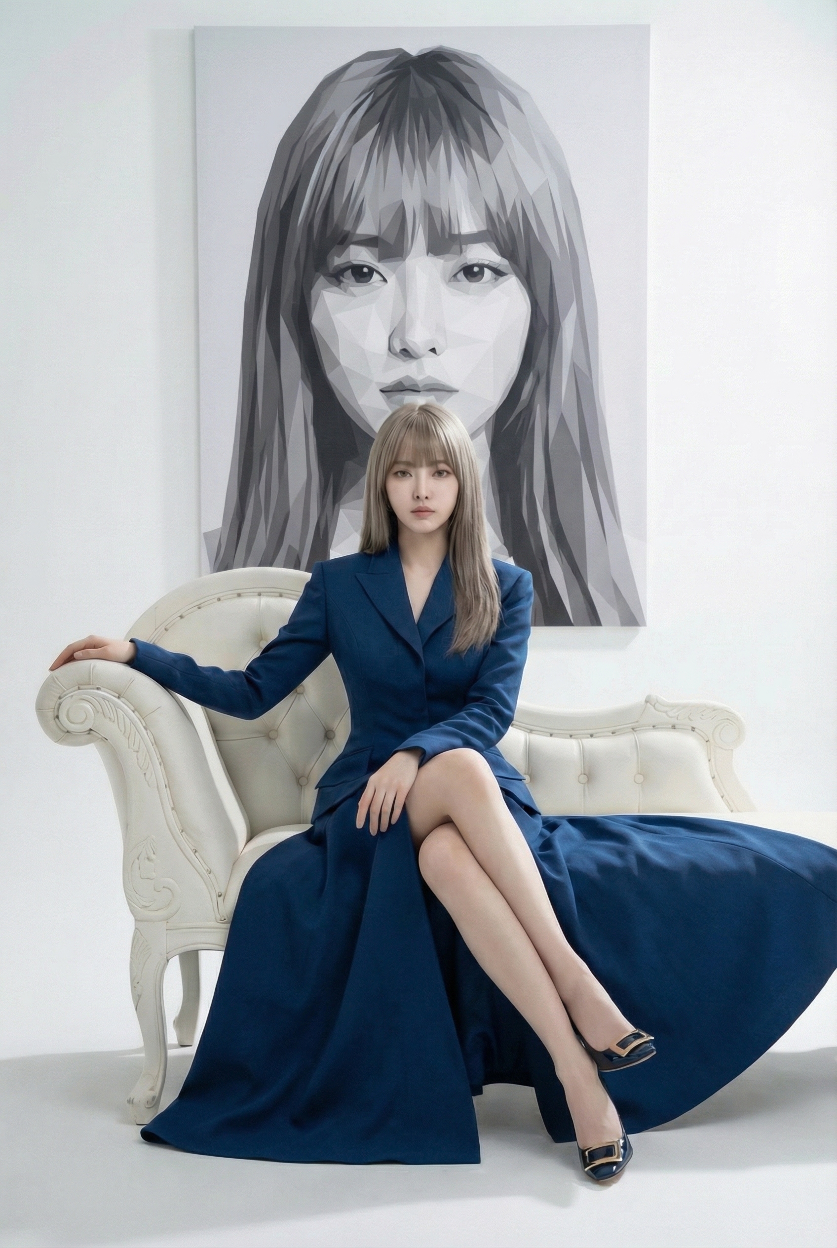 CopyA high-fashion studio portrait of a woman seated elegantly on a white vintage chaise lounge, wearing a structured deep blue tailored dress with a long flowing silhouette. She poses confidently with one arm resting on the armrest, legs crossed, and a calm editorial expression. Behind her is a large monochrome geometric wall portrait of her own face rendered in angular polygonal shapes. Minimalist studio setting, soft diffused lighting, clean white background, cinematic shadows, realistic skin tones, luxury fashion editorial style, fine-art composition, subtle contrast, ultra-high resolution, refined and timeless mood.