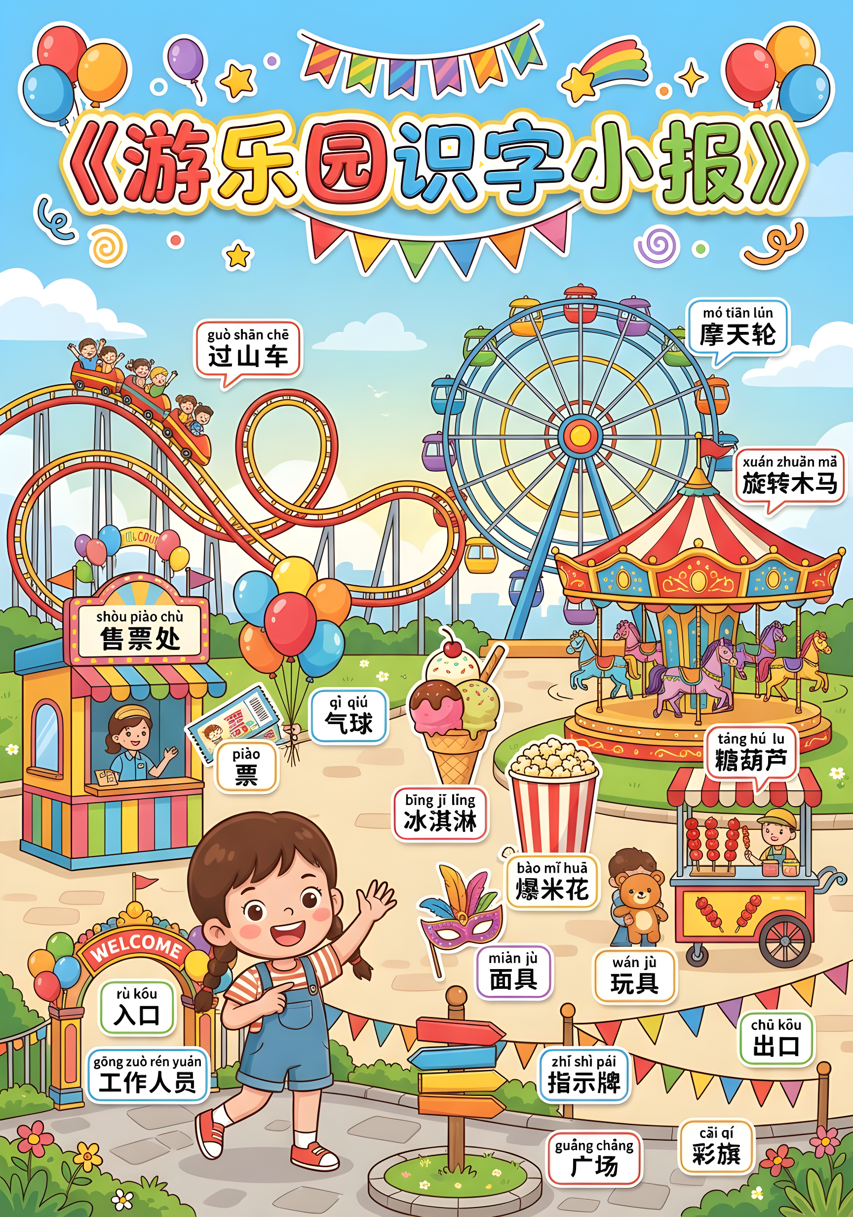 CopyCreate a children's literacy handout titled "Amusement Park" in vertical A4 format, designed as an educational handout suitable for 5-9 year olds to learn characters and object recognition through images. I. Header Section (Top) - Centered large title at the top: "Amusement Park Literacy Handout" - Style: Educational handout/Children's learning newspaper style - Text requirements: Large, eye-catching, cartoon handwritten font with colored outlines - Decoration: Add sticker-style decorations related to amusement parks around the title, using bright colors II. Main Body (Central Illustration) - Center features a cartoon-style "amusement park" scene: - Overall atmosphere: Bright, warm, positive - Composition: Clear object boundaries for easy text matching, avoid overcrowding Scene Zones and Core Content: - Zone A (Main objects): Depict core amusement park activities (children playing on rides) - Zone B (Supporting facilities): Display related tools or items (ticket booth, snacks, signage) - Zone C (Environment): Show environmental features (entrance, signs, colorful flags, green spaces) Theme Character: - Character: 1 cute cartoon character (can be amusement park staff or child visitor) - Action: Natural interaction with the scene (e.g., smiling while giving directions, waving welcome, playing with children) III. Required Objects and Vocabulary List Clearly draw the following objects in the scene, reserving space for labels: 1. Core characters and facilities: gōng zuò rén yuán (Staff) shòu piào chù (Ticket Booth) guò shān chē (Roller Coaster) mó tiān lún (Ferris Wheel) xuán zhuǎn mǎ (Carousel) 2. Common items/tools: piào (Ticket) qì qiú (Balloon) bīng jī líng (Ice Cream) bào mǐ huā (Popcorn) táng hú lu (Candy Apple) miàn jù (Mask) wán jù (Toy) xiǎo qí zi (Small Flag) 3. Environment and decorations: rù kǒu (Entrance) chū kǒu (Exit) zhǐ shì pái (Sign) cǎi qí (Colorful Flag) guǎng chǎng (Plaza) (Note: The scene may include additional objects, but the above list must be prominently featured; total of 18 typical nouns suitable for 5-9 year olds' literacy development) IV. Labeling Rules For the objects in the above list, attach Chinese literacy labels: - Format: Two-line system (first line: pinyin with tones, second line: simplified Chinese characters) - Style: Colorful sticker style, white background with black or dark text, clearly readable - Layout: Labels placed near corresponding objects without blocking main elements V. Art Style Parameters - Style: Children's picture book style + Educational handout style - Colors: High saturation, bright, warm tones - Quality: 8k resolution, high detail, vector illustration style, clean lines