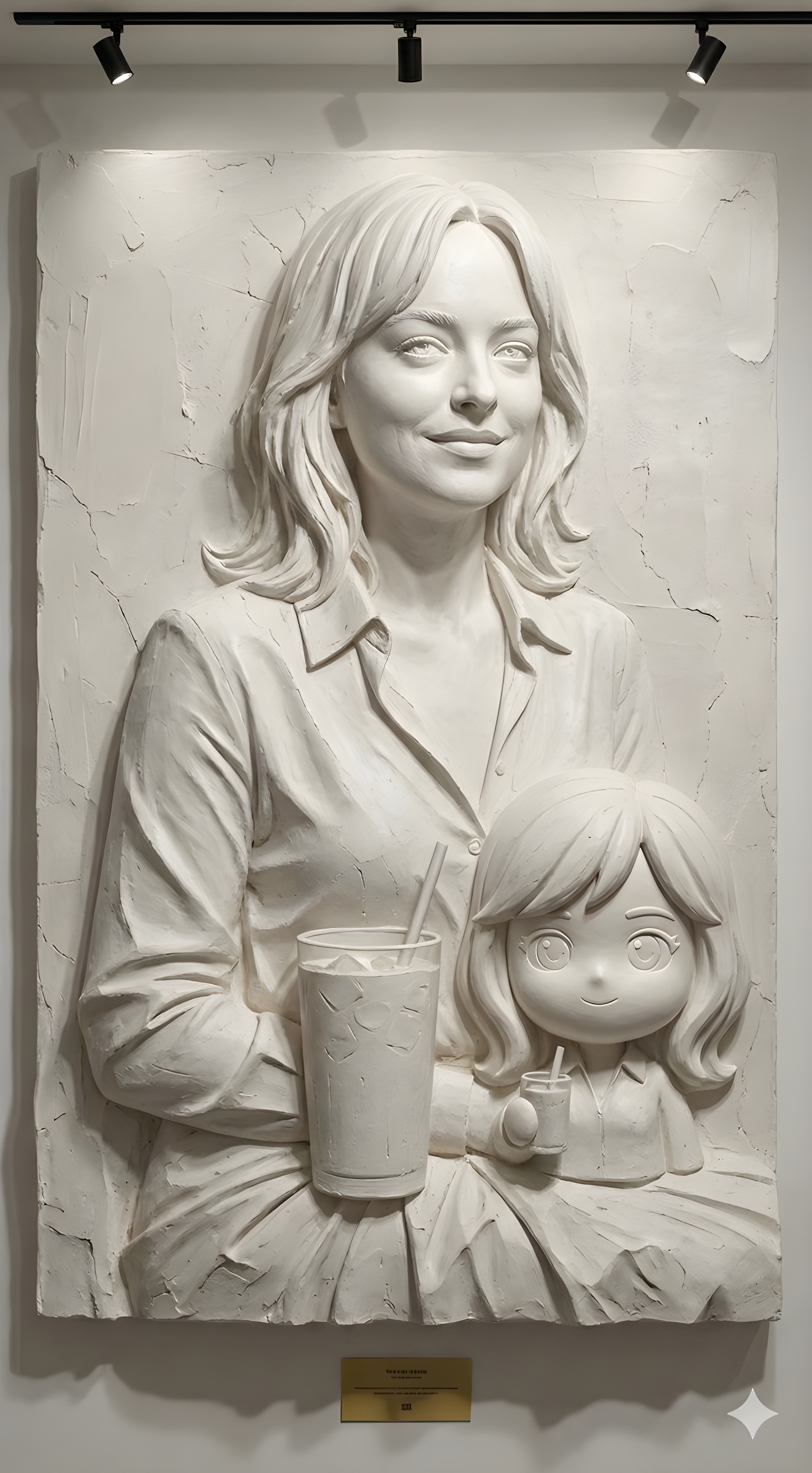 CopyTransform the image into a plaster relief sculpture. Raised forms emerging from a flat surface. Soft matte white texture with subtle imperfections. Gallery-style sculptural artwork. Subtle directional lighting to emphasize depth and shadows. Handcrafted finish with visible tool marks and organic surface variation. Minimal, neutral background to enhance the sculptural presence.