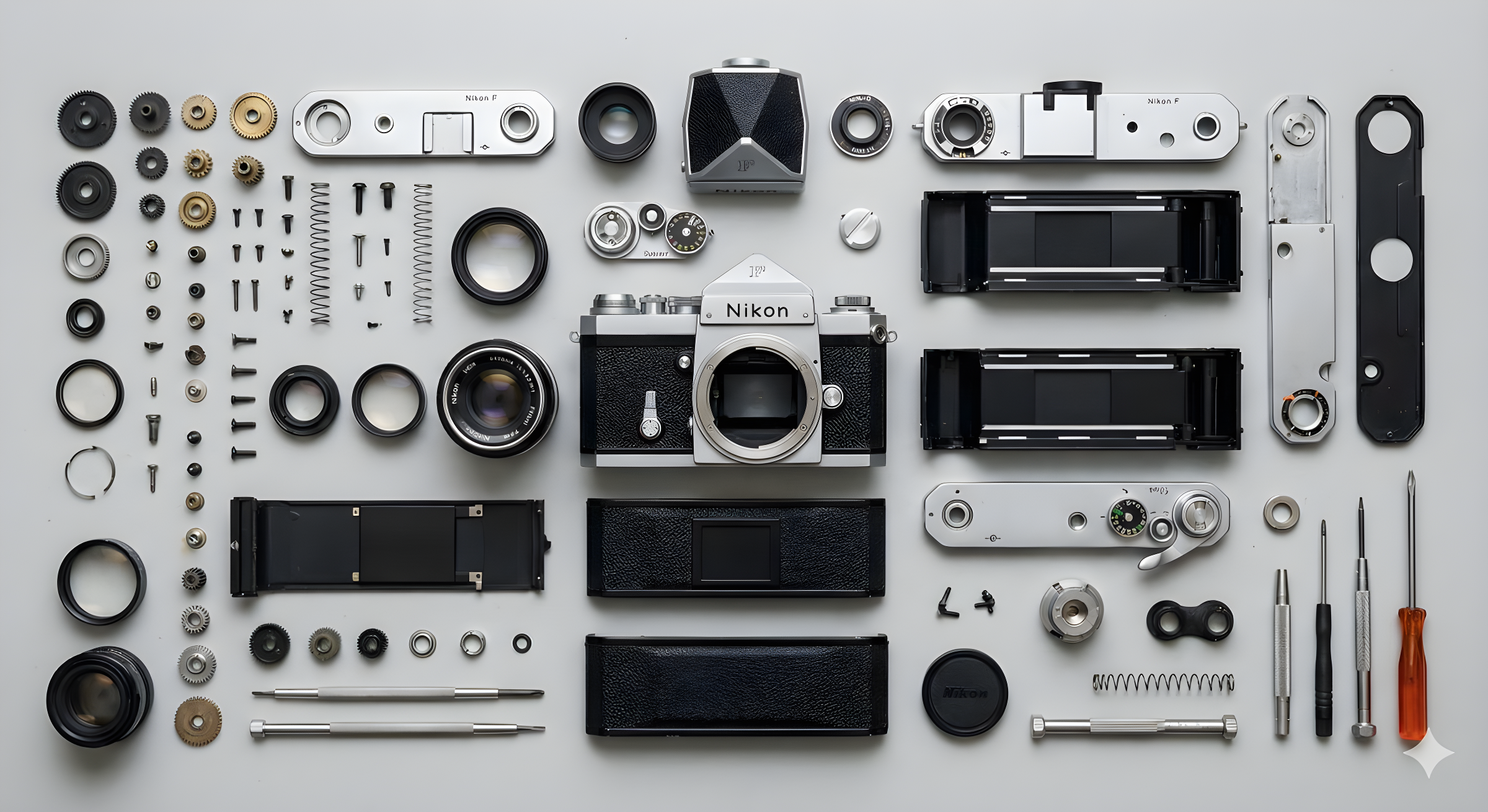 CopyKnolling photography, disassembled parts of a vintage film camera neatly arranged on a flat surface, high angle shot, flat lay, technical aesthetic, sharp focus, clean background.