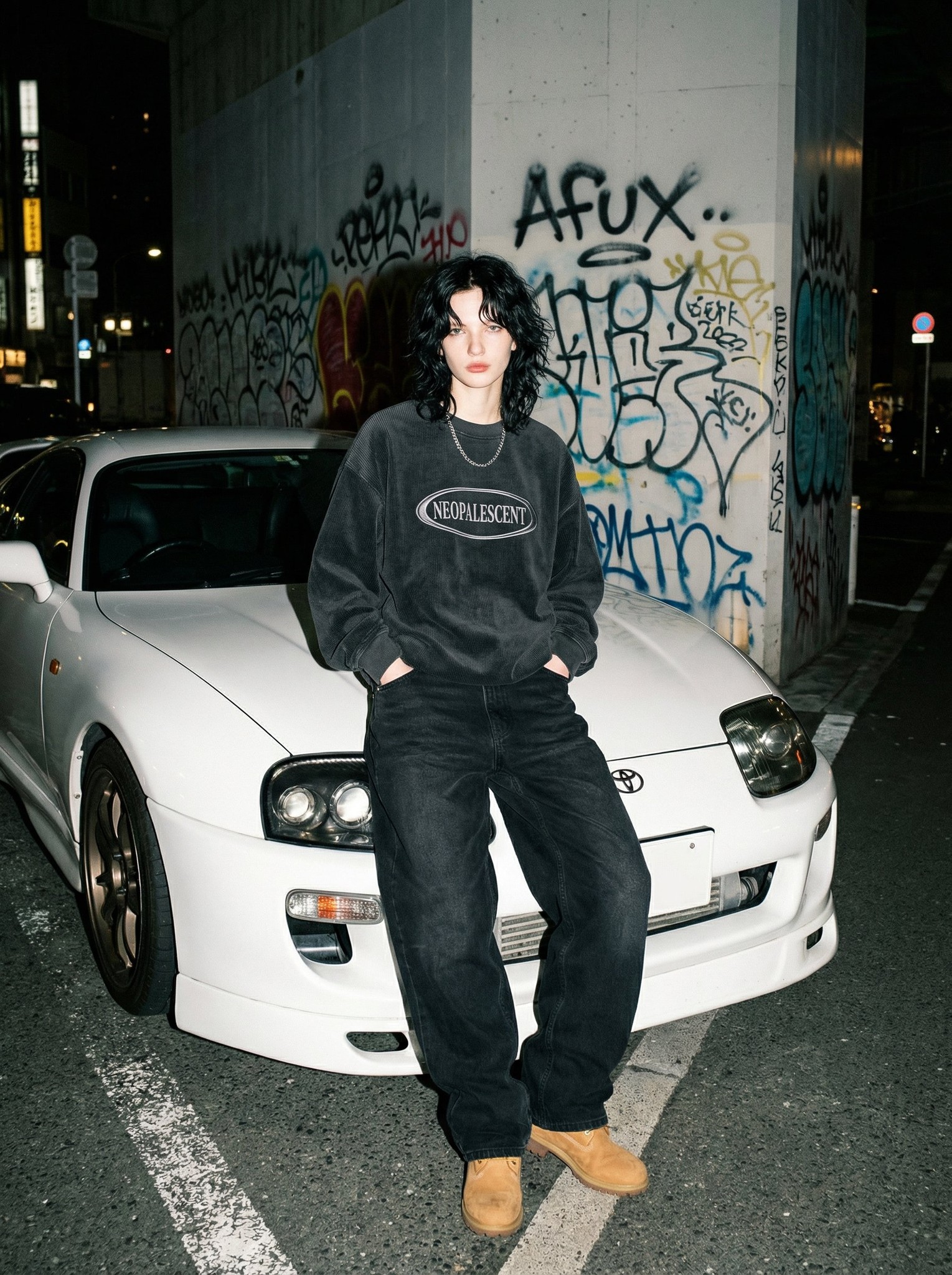 CopyA realistic, candid full body photo of a young woman, use my face exactly from my reference image, leaning casually against the hood of a modified white Toyota Supra MK4 at night. She has messy, wavy black hair in a wolf cut and is looking directly at the camera with a calm, confident expression. She is wearing a silver chain necklace, an oversized dark charcoal grey corduroy crewneck sweatshirt with the text "NEOPALESCENT" inside an oval logo on the chest, baggy loose fitting black denim jeans, and tan suede boots. Her hands are in her pockets. The background is a gritty urban street corner with a concrete wall heavily covered in graffiti tags and "Afux" written on the wall. The lighting is direct camera flash style, creating hard shadows behind the subject and a high contrast vintage 90s streetwear aesthetic. 4K resolution, raw photo style, flash photography.