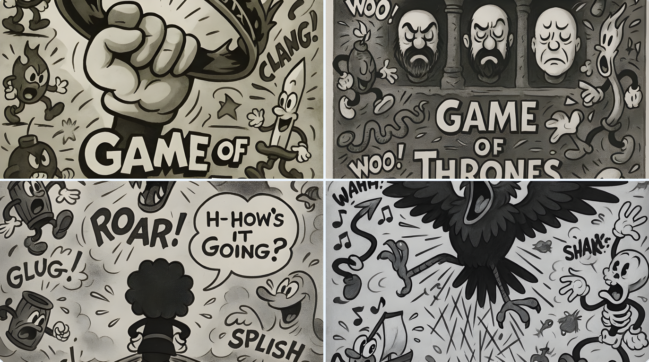 CopyTransform this image into a 1930s animation storyboard in the style of Fleischer Studios. Use greyscale with expressive inky shading and rubber-hose limbs. Surround the scene with anthropomorphic objects, bouncy motion lines, and slapstick action. The overall tone should be jazzy, lively, and playful. Add hand-lettered sound effects and quirky dialogue signs.