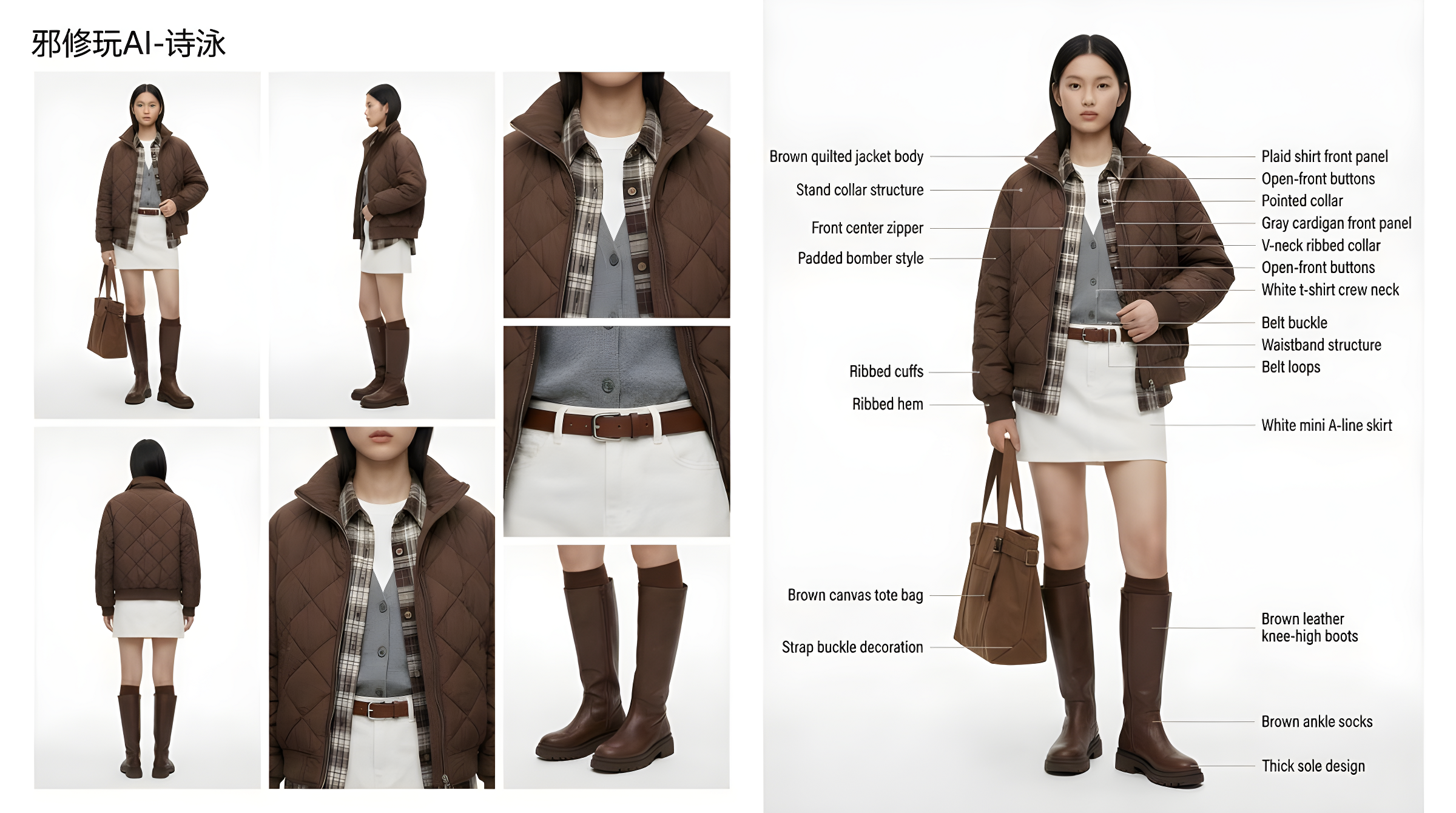 CopyMinimal, premium fashion presentation layout inspired by high-end industrial design documentation and contemporary fashion lookbooks. Pure white, clean, distraction-free background. A young, stylish, attractive model wearing the garment. Multiple auxiliary garment views: Front view, Side view, Rear view, Detail close-up. Annotation lines pointing to garment components with technical descriptions. Modern Scandinavian fashion documentation with industrial design influence. Ultra-high resolution, soft and realistic shadows.