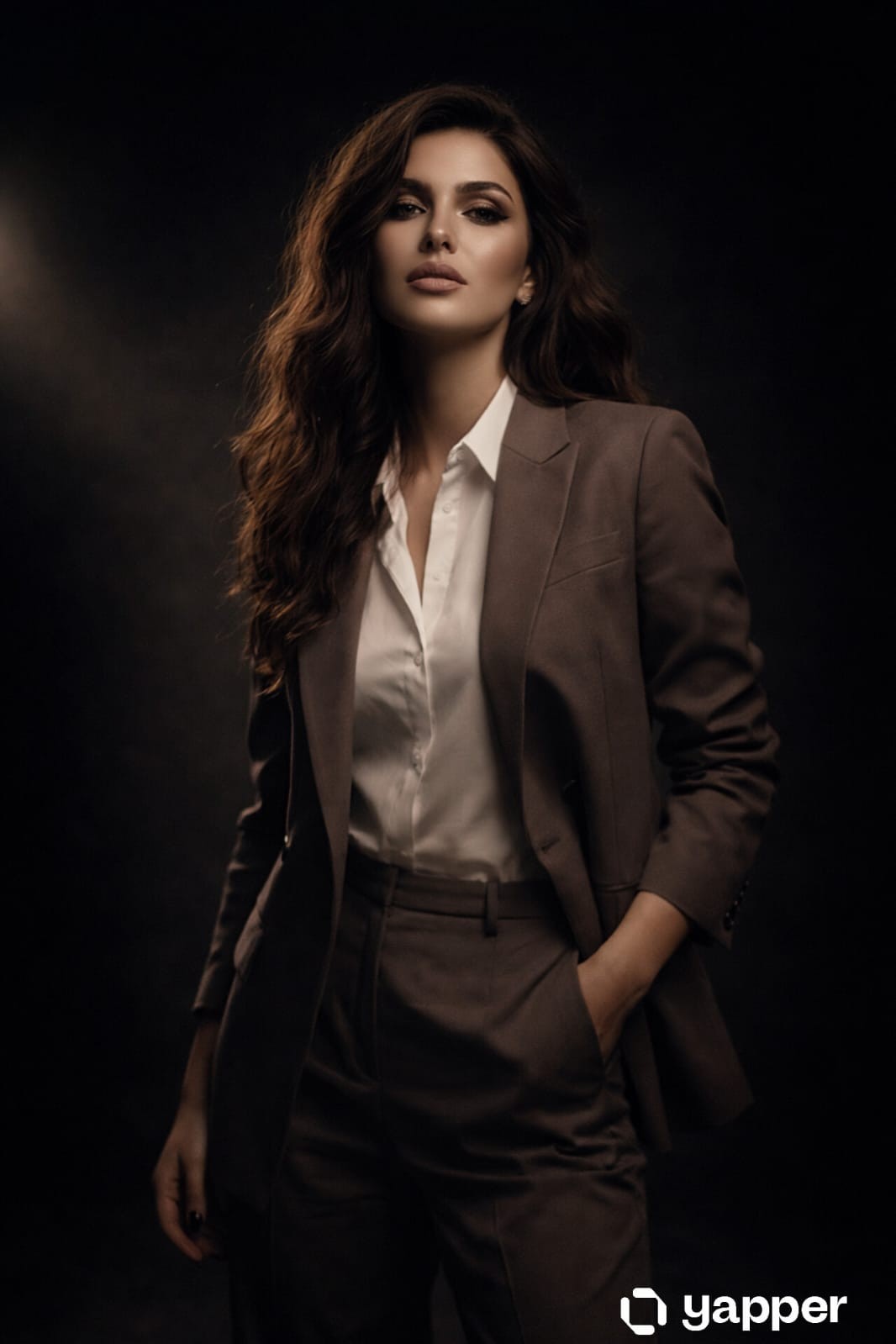 Dark Studio Spotlight Blazer Suit Confident Woman Editorial Portrait