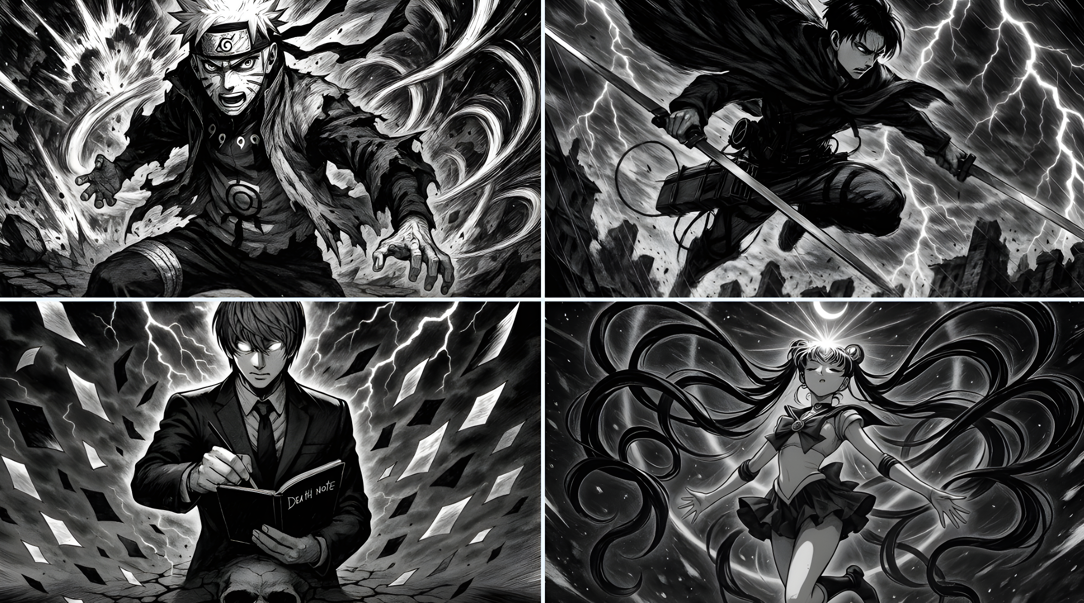 CopyHighly dramatic and epic black and white manga-style illustration of [Your character and description]. Powerful, dynamic pose, exaggerated features emphasizing the intensity of the scene. Background with explosive energy bursts, lightning effects, and a whirlwind of debris