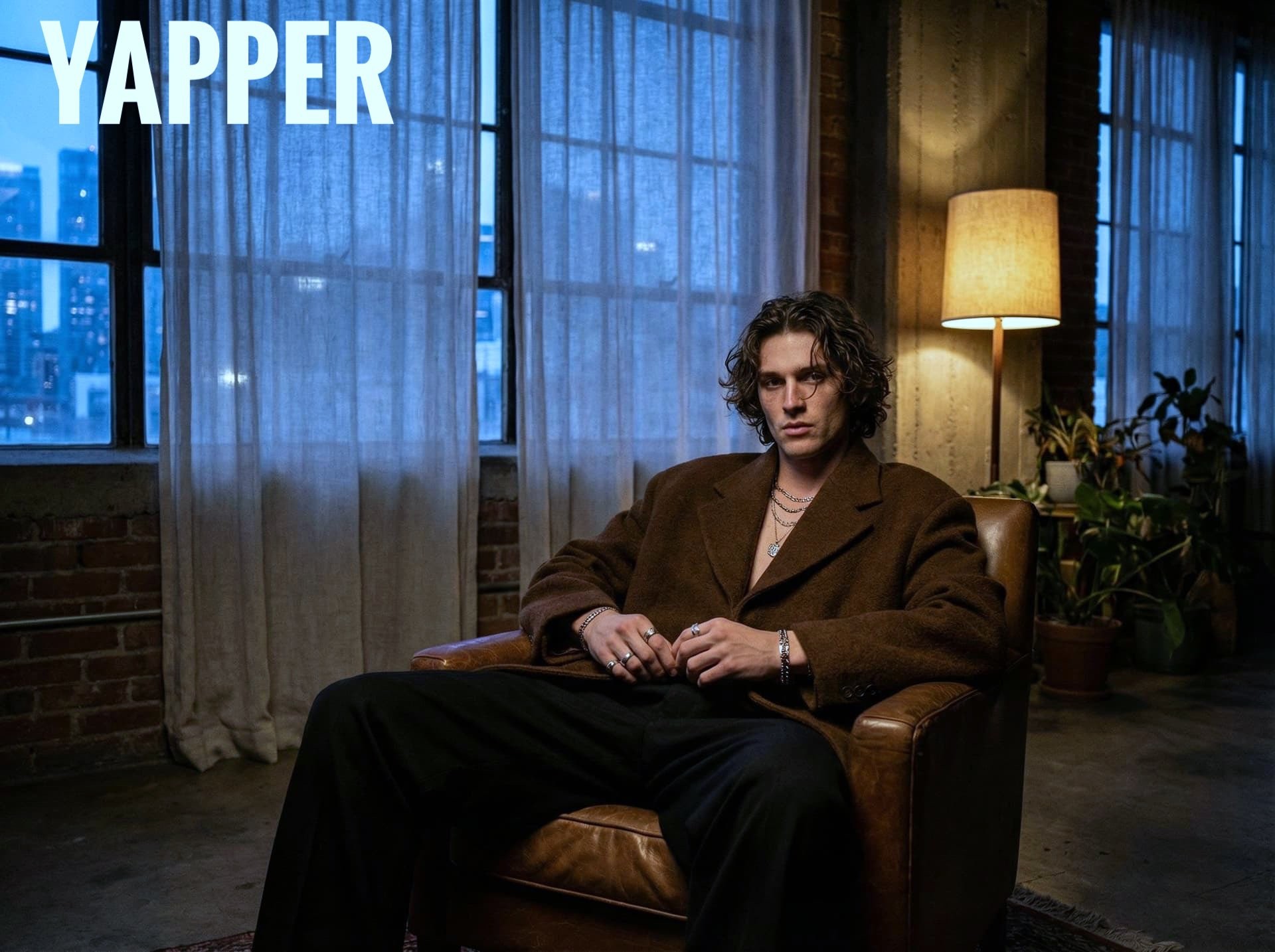 CopyMoody dark aesthetic indoor loft scene at night, large window behind with faint city glow filtering through sheer curtains, soft blue ambient light mixed with warm side lamp creating depth, male model sitting casually on leather chair, aesthetic oversized deep brown textured jacket with wide black trousers, layered subtle jewelry, natural wavy hair with volume, relaxed yet intense gaze, hands loosely clasped, ultra realistic skin and fabric details, cinematic lighting with balanced highlights and shadows, 4K ultra realistic, Sony A7R V. 85mm f/1.8 lens, ISO 250, f/2.0, 1/125s, high-fashion editorial composition