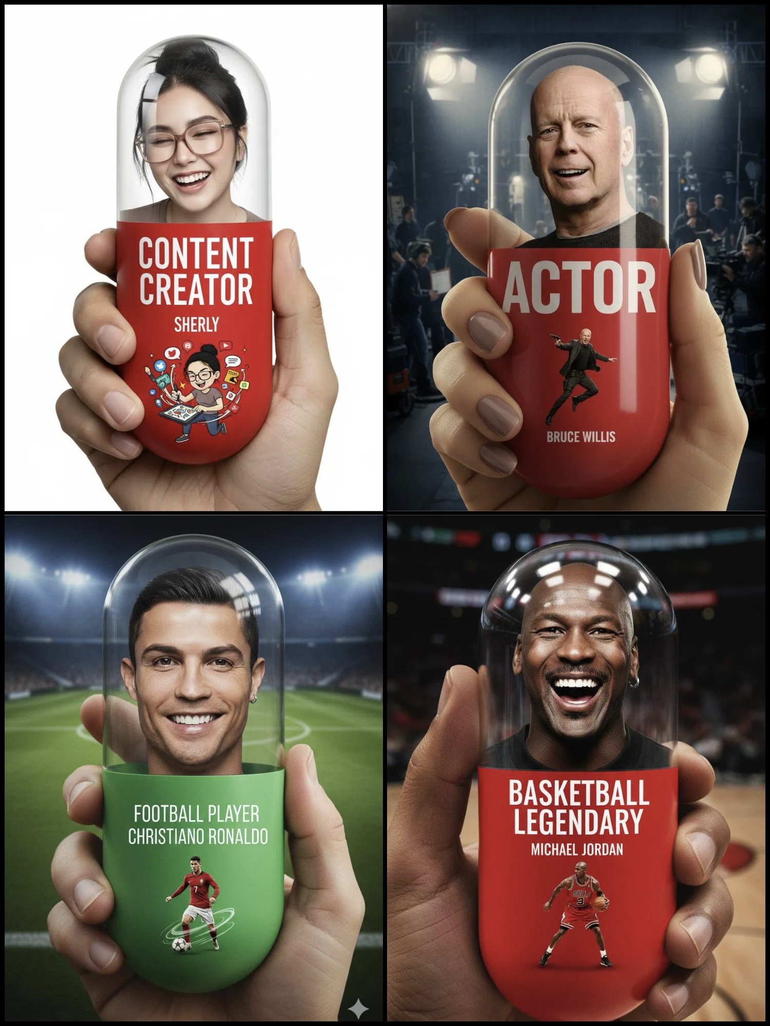 CopyExtreme close-up of a human hand holding a giant vertical pill. The pill has a clear glass top section and the lower 3/4 is matte bright-red, with bold, clean, perfectly aligned typography that reads: BASKETBALL LEGENDARY. Inside the pill, show a person whose face must match the attached photo 100% exactly — no changes to facial structure, proportions, expression baseline, or any detail. The face must display a natural, realistic, wide laughing expression. Inside the pill, the person is performing a dynamic basketball dribbling pose with high energy, labeled with the account name 'MICHAEL JORDAN'. Scene style: funny, chaotic, thrilling, slightly creepy, and intense. Background: an NBA basketball court, with full cinematic lighting, dramatic shadows, and rich color depth. Camera angle: aerial extreme close-up focused on the pill in the hand. Texture: ultra-HD realism with fine grain, crisp micro-details, glass reflections, and smooth matte material fidelity. Ratio 3:4. Ensure motion, energy, and dynamic movement inside the pill while keeping the pill perfectly vertical.