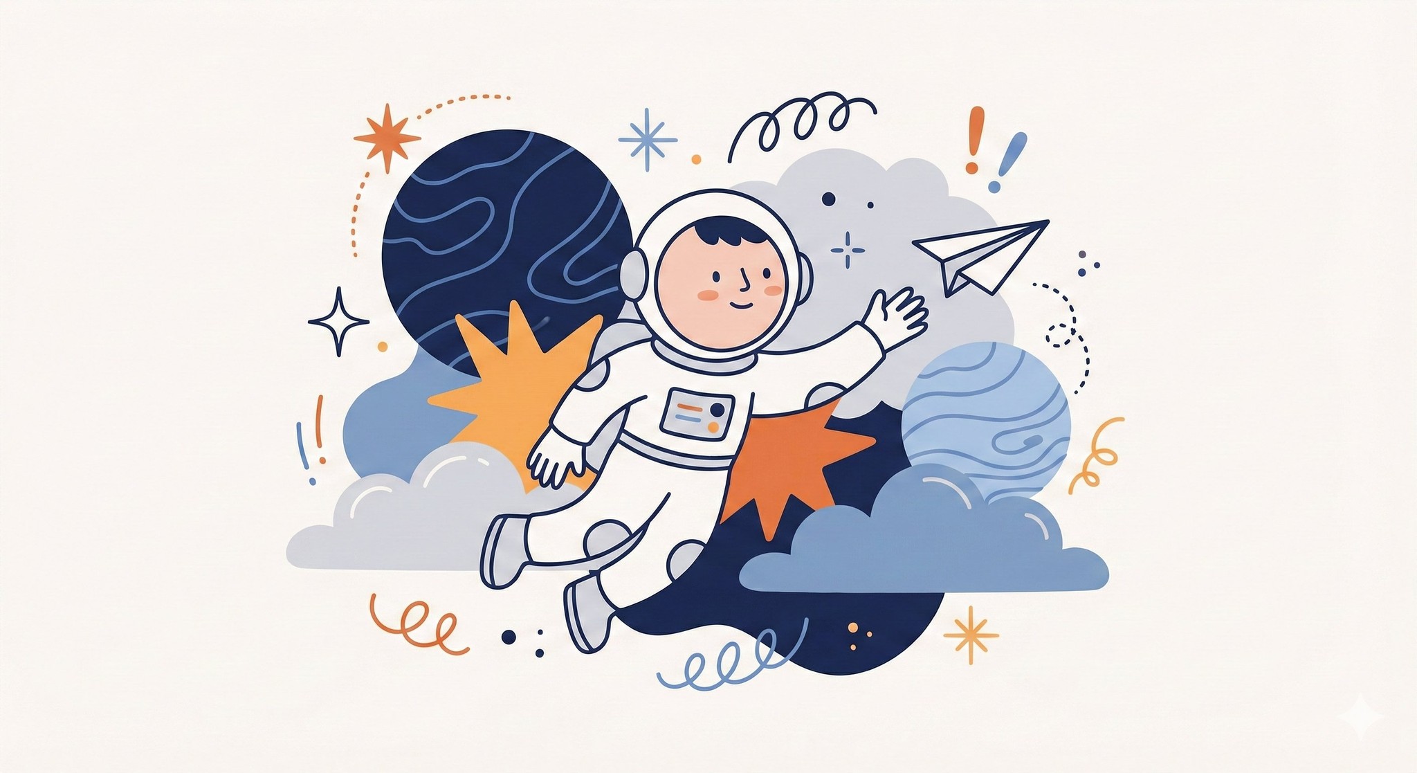 CopyCreate a whimsical, playful illustration featuring an astronaut as the central focus. The character is drawn with simplified features, a small rounded head, and minimal facial detail, wearing a space suit and helmet. They are positioned among oversized abstract shapes and organic elements such as stars, planets, and cosmic flowers, creating a sense of imaginative scale. The character is interacting with floating objects, adding narrative interest. Decorative graphic elements like exclamation points, speech bubbles, scribbles, and notes float around the subject to enhance expression and energy. Use clean, simple linework and a limited color palette of blue, orange, and white, keeping the illustration bold and cohesive. The background is a soft neutral tone such as beige or off-white. The overall style is modern, flat, and illustrative, with a lively, creative, and slightly abstract atmosphere.