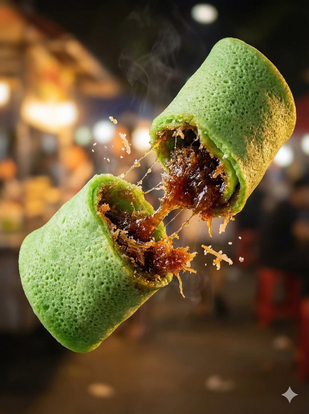 CopyUltra-realistic floating street food, crispy dessert/snack split mid-air, gooey caramel/cheese filling stretching between halves, crumbs and steam particles flying, night market background with warm bokeh lights, shallow depth of field, dramatic lighting, macro food photography, high detail, 8K, sharp focus, cinematic, volumetric steam.