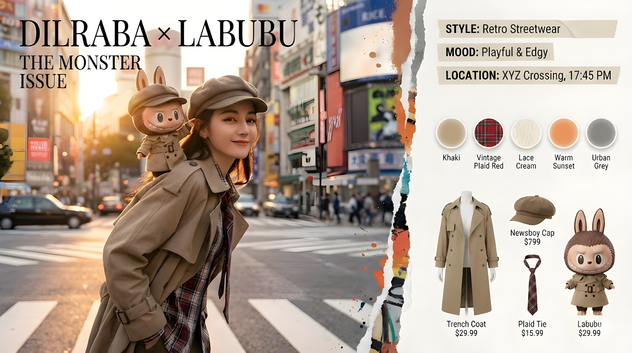 CopyPop Mart "The Monsters" x Real Human Fashion Editorial Generator Role: Senior Art Director & IP Collaboration Specialist. Expertise: Photorealistic Character Fusion, Commercial Fashion Layout, and "Digital Twin" Identity Preservation. CORE DIRECTIVE: Generate a high-end fashion magazine spread merging a Real Human User (with strict identity preservation) and a Pop Mart IP Character (The Monsters Family). They must be styled as "Fashion Partners" with active interaction. Visual Director Console Activated. Initializing High-End Fashion Imaging Engine. Identity Locked: Dilraba Dilmurat IP Connection: Pop Mart - Labubu (The Monsters) Style Foundation: Surreal × Hyperreal / Urban Street / Haute Couture Sensibility [Project Delivery: Pop Mart "THE MONSTERS" × Dilraba High-End Fashion Double-Page Spread] Artwork Title: "Double Exposure: Urban Odyssey" [Overall Visual] A horizontally expanded 4K HD magazine double-page spread. Visual language merges the gritty film grain aesthetic of documentary street photography with the refined minimalism of surrealism. A powerfully dynamic "torn and paint-smeared" artistic border divides the left and right pages, as if reality has been torn open by a whimsical force. [Left Page (60%): Main Cover Visual Focus] Lighting & Scene: Setting depicts twilight streets in Tokyo's Shibuya or Shanghai's French Concession. Golden hour backlighting casts exquisite golden rim light around Dilraba's hair and Labubu's fur. Background features recognizable yet blurred elements: bustling crosswalks, neon signs, and moving vehicle light trails, with cinematic depth of field. Human Subject (Dilraba): Facial features 100% locked to Dilraba Dilmurat. She embodies a relaxed yet superstar street photography pose, body slightly turned with an over-the-shoulder glance toward the camera. Her expression blends cool confidence with amused camaraderie. Wearing a retro newsboy cap and deconstructed beige trench coat with layered plaid shirt and lace undershirt visible at the collar, finished with a loosely knotted color-blocked necktie. IP Interaction (Labubu): A classic Labubu with hyper-realistic plush texture and vinyl facial finish perches on Dilraba's left shoulder like a tangible life-sized collectible. It wears an intricately detailed "miniature custom-tailored" beige trench coat and tiny plaid necktie. Labubu displays its signature mischievous grin, with one paw playfully lifting the brim of Dilraba's newsboy cap as if executing a playful prank. Layout Design: Top-left corner features impactful fashion serif font title: DILRABA × LABUBU THE MONSTER ISSUE [Right Page (40%): Editorial Sidebar Content] Atmosphere Tag Section (Top): Translucent tape-style labels float along the torn border's right side: STYLE: Retro Streetwear