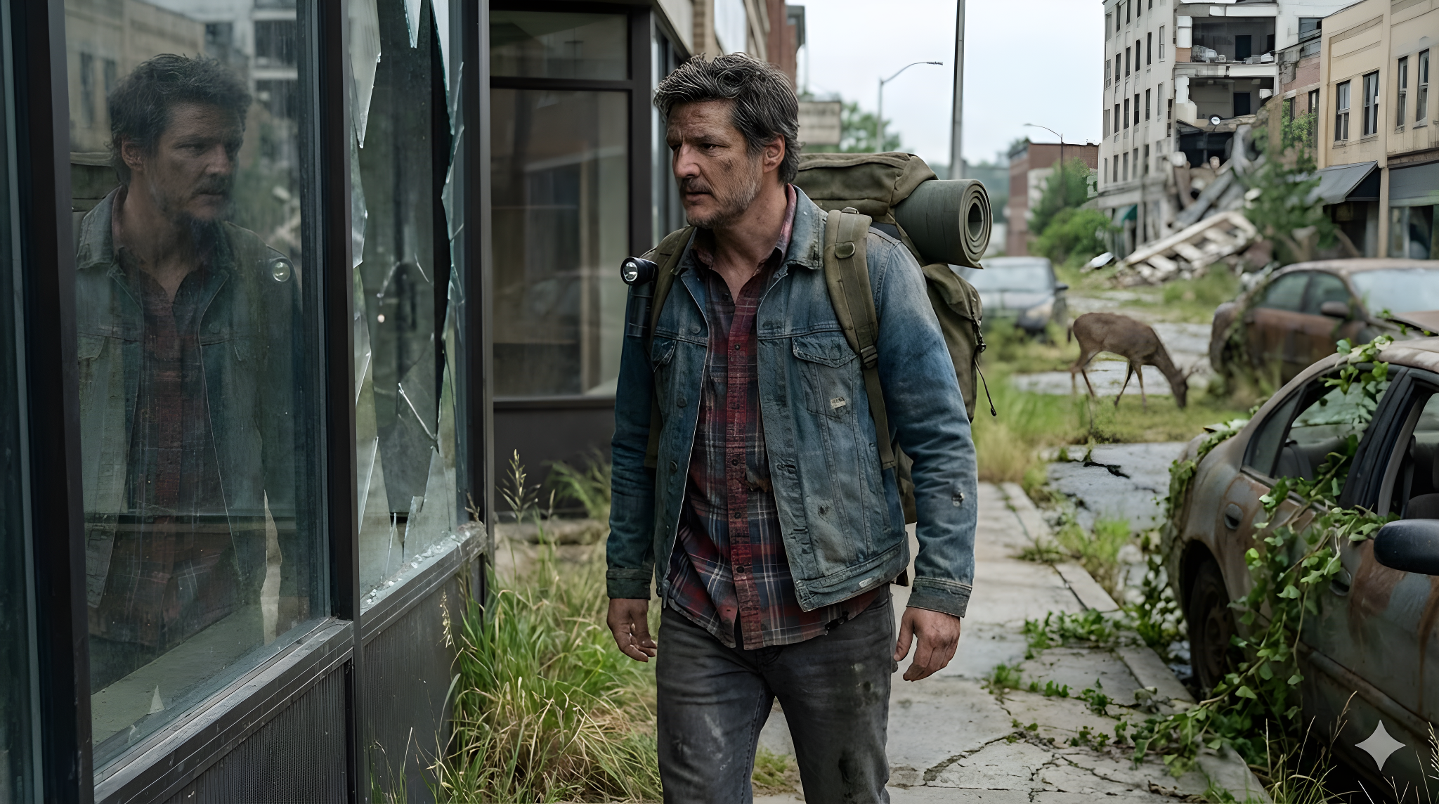 Copydescription. A rugged male survivor walking through an overgrown city street. mirror_rules. Reflection in broken shop window. expression. wary, scanning the horizon, tired. salt and pepper. overgrown, messy beard. flannel shirt and denim jacket. faded blue and red plaid. holes in elbows, sun-bleached, dirt stains. , . , . muddy knees, frayed hems. dirt smudges, sun spots, realistic weathering. accessories. }, . broken analog watch. wedding band on chain around neck. flashlight. clipped to backpack strap. hiking backpack. large, olive green, bedroll attached, worn fabric. photography. camera_style. Cinematic realism, 35mm wide lens. wide shot establishing environment. full body walking away from camera slightly. aspect_ratio. detailed foliage, crisp sunlight, natural colors. background. ruined city street reclaimed by nature. wall_color. concrete covered in ivy. tall grass cracking through pavement. collapsed building in distance. deer visible in background. atmosphere. quiet, desolate, beautiful decay. overcast soft daylight, diffuse shadows, melancholy feel