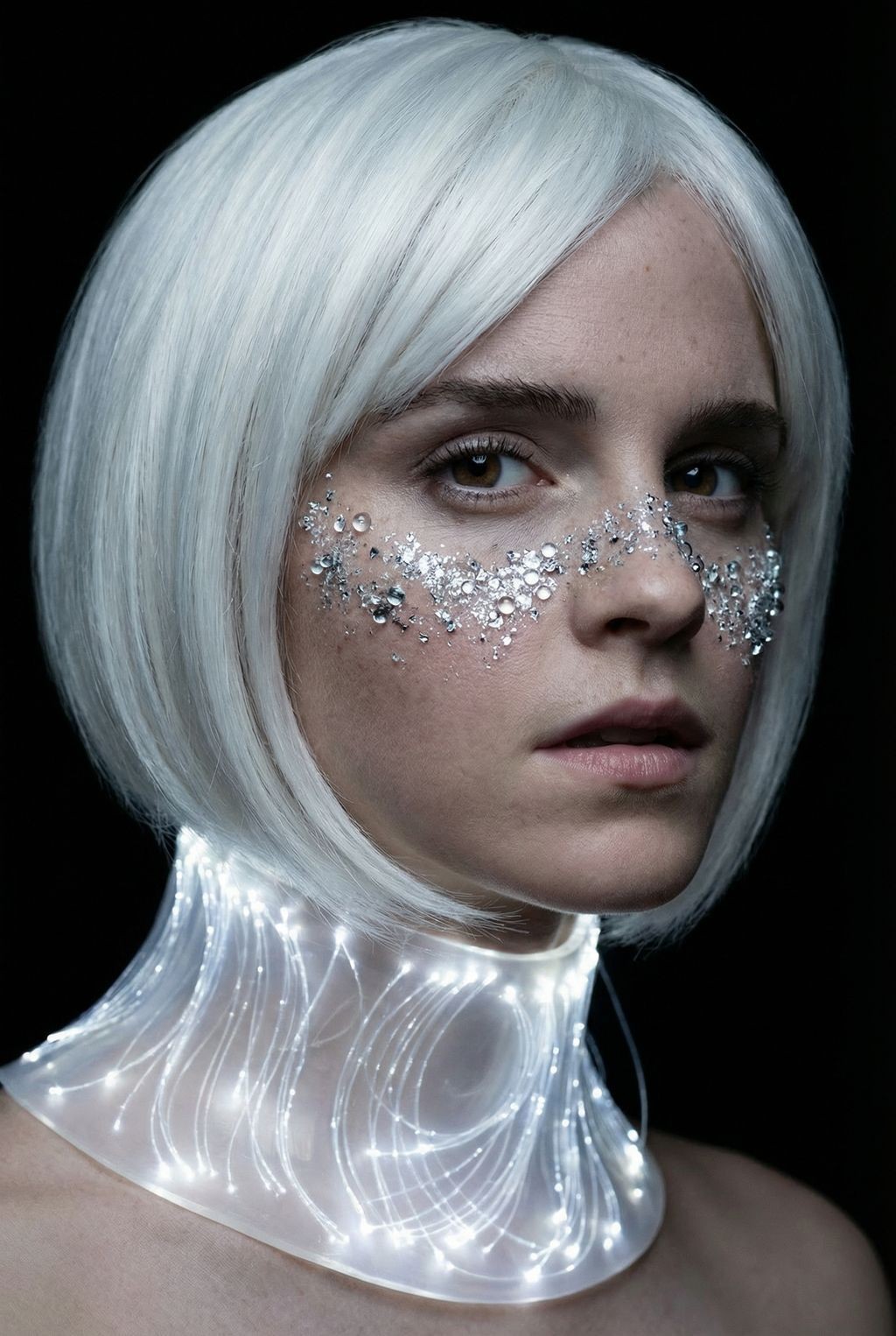 Copy{ "vibe_title_en": "Crystallized Bioluminescence", "master_prompt": "A hyper-realistic cinematic portrait of The Protagonist captured in a pitch-black sensory deprivation chamber. The subject features a sharp, platinum-white bob cut. The key visual is 'Practical Effect' avant-garde makeup: a band of crushed diamond dust and reflective glass microspheres applied across the bridge of the nose and cheeks, physically catching the light like a galaxy. They are wearing a translucent silicone high-neck collar embedded with active, glowing white fiber-optic filaments. The lighting is strictly diegetic, emanating from the collar and reflecting off the glitter makeup, casting a soft, cold ethereal glow on the skin. Shot on a Hasselblad H6D-100c with an 80mm f/1.9 lens to capture extreme micro-detail of skin pores, vellus hair, and the refractive quality of the glass dust. The aesthetic is 'Grounded Cyberpunk'—no neon signs, just cold, clinical, high-tech fashion textures. Cinestill 800T film stock emulation for subtle halation around the light sources.", "frame": { "aspect": "2:3", "composition": "Rule of Thirds, slightly angled portrait" }, "subject": { "gender": "Female", "face": "Symmetrical, intense gaze, diamond-dust makeup strip across eyes", "hair": "Platinum white, sharp bob cut, straight", "expression": "Ethereal, calm, slightly parted lips, hypnotic stare" }, "wardrobe_accessories": { "garments": [{ "item": "High-neck collar bodysuit", "material": "Translucent Silicone / Fiber Optics", "color": "Glowing White / Transparent" }], "accessories": [{ "item": "Integrated Light Mesh", "material": "LED Filaments", "brand_style": "Iris van Herpen meets Cybernetics" }] }, "environment": { "setting": "Sensory Deprivation Chamber / Void", "atmosphere": "Cold, sterile, intimate, silent" }, "lighting": { "key": "Diegetic (emanating from the neck collar)", "color_temperature": "6500K", "sensor_flare": "Cinestill Halation" }, "camera": { "focal_length": "80mm", "aperture": "f/1.9", "sensor_format": "Medium Format (Hasselblad)" } }
