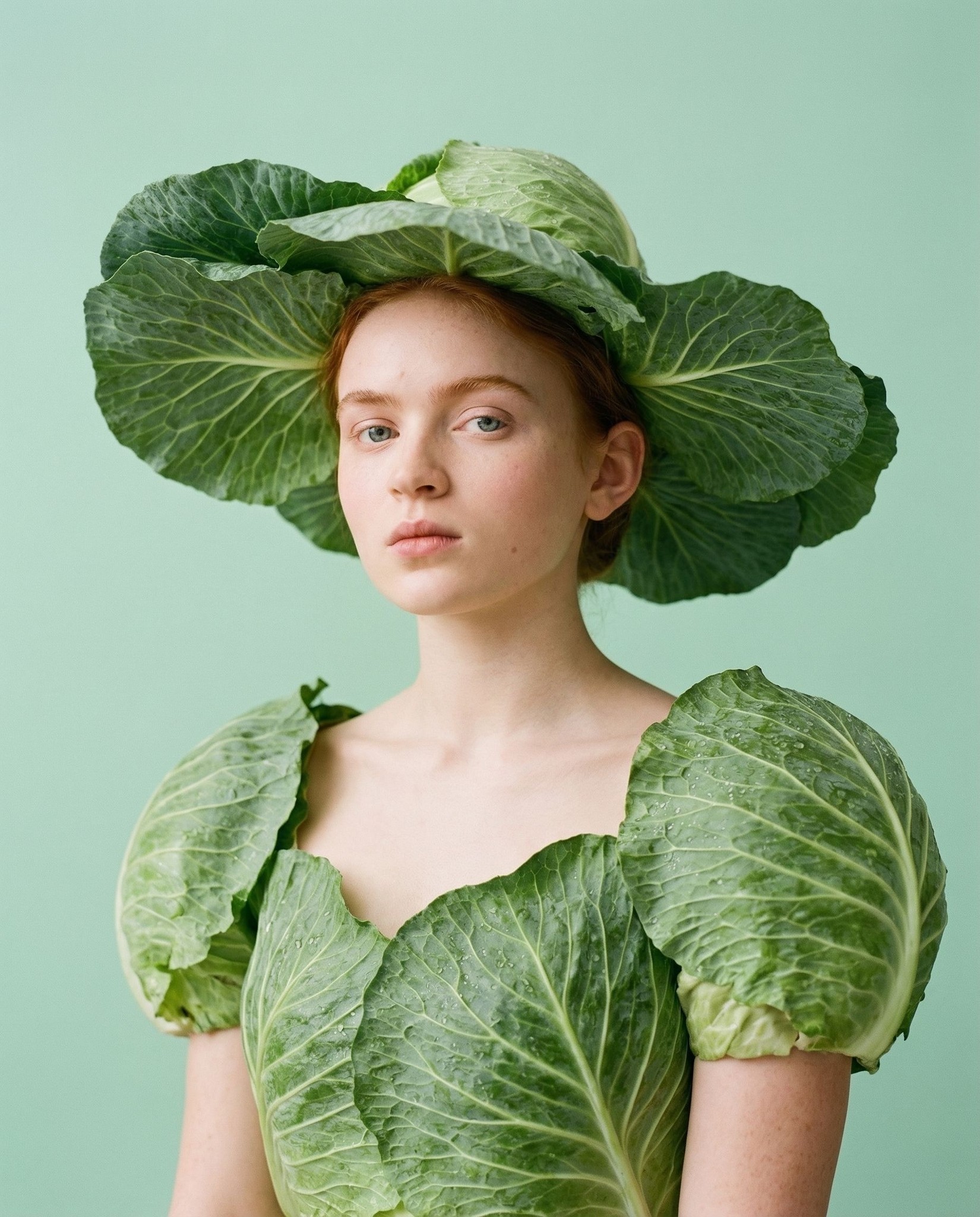 Botanical Haute Couture Cabbage Leaf Hat Mint Green Editorial Portrait