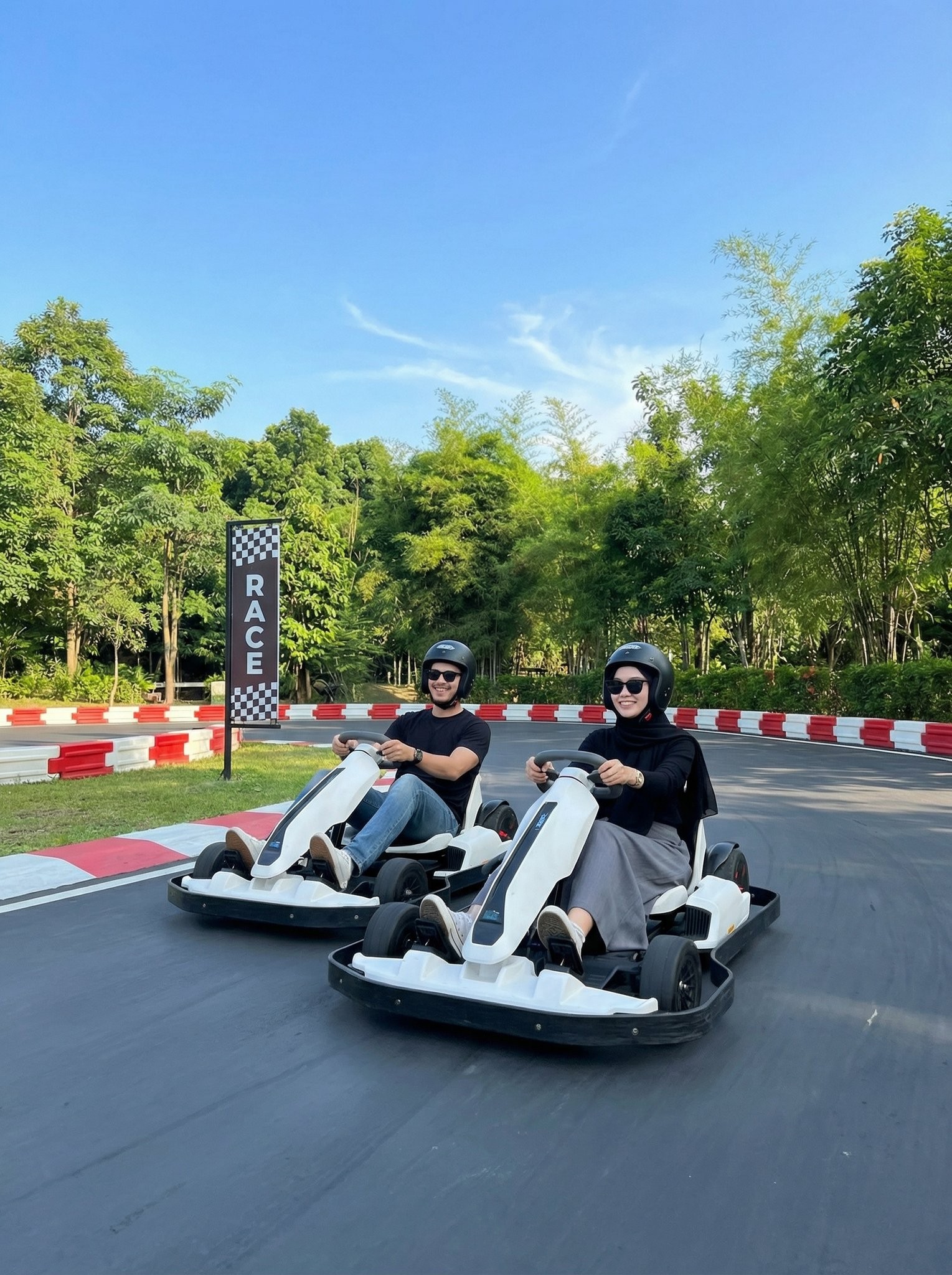 CopyTwo people racing side-by-side in modern white go-karts on a smooth outdoor racetrack, both wearing black helmets and sunglasses. The driver on the right is a woman wearing a black hijab, black top, and long gray skirt, smiling confidently. The driver on the left is a man in a black t-shirt and jeans, smiling while driving. The track has red and white safety barriers, a vertical "RACE" sign with a checkered pattern, and is surrounded by lush green trees and bamboo. Bright blue sky with soft daylight, natural shadows, cinematic wide-angle shot, realistic motion blur on the track, ultra-realistic photography, high detail, vibrant colors, professional DSLR quality, 4K, sharp focus.