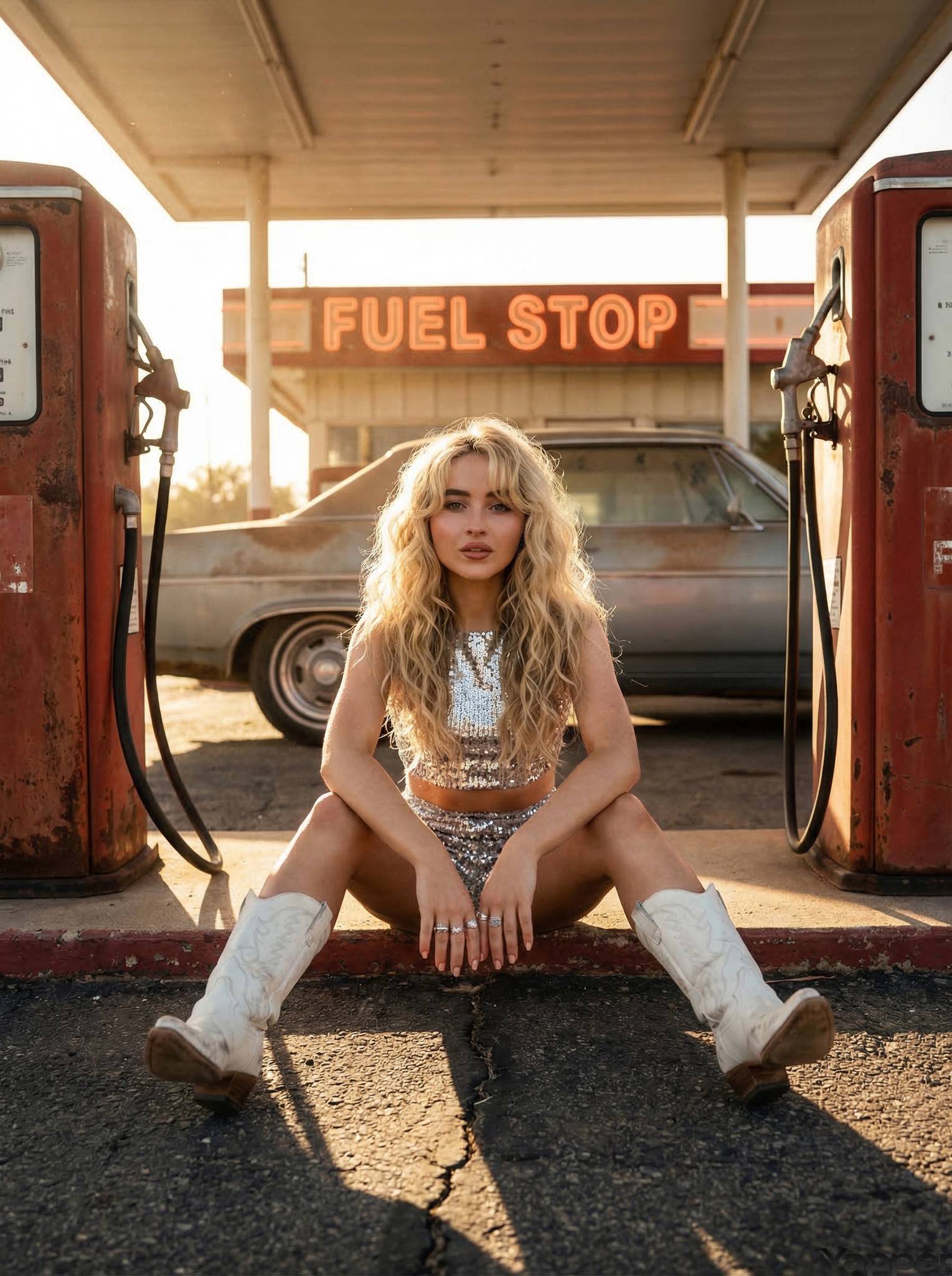 Copy{ "image_generation_prompt": { "subject": { "description": "Young woman with a strong resemblance to Sabrina Carpenter.", "hair": "Long, voluminous waves.", "face": "Neutral expression, clear skin. No glasses.", "body": "Toned, tanned." }, "attire": { "clothing": "Sparkly silver crop top, matching shorts, white cowboy boots.", "style": "Retro Americana." }, "styling_and_accessories": { "jewelry": ["Rings"] }, "environment": { "setting": "Between vintage red gas pumps.", "background": "Retro station, neon 'FUEL STOP' sign, classic car.", "water": "None" }, "pose": { "posture": "Sitting on ground, legs wide.", "arms": "Resting on knees.", "angle": "Low-angle, symmetrical." }, "lighting_and_mood": { "lighting": "Golden hour backlight.", "mood": "Nostalgic cinematic.", "colors": "Warm gold, faded red." }, "camera_and_technical": { "style": "Ultra Photorealistic, RAW photo.", "lens": "35mm", "aperture": "f/2.8", "quality_tags": ["8k resolution", "highly detailed", "volumetric lighting", "ray tracing reflections", "hyper-realistic texture", "Hasselblad photography"] } } }