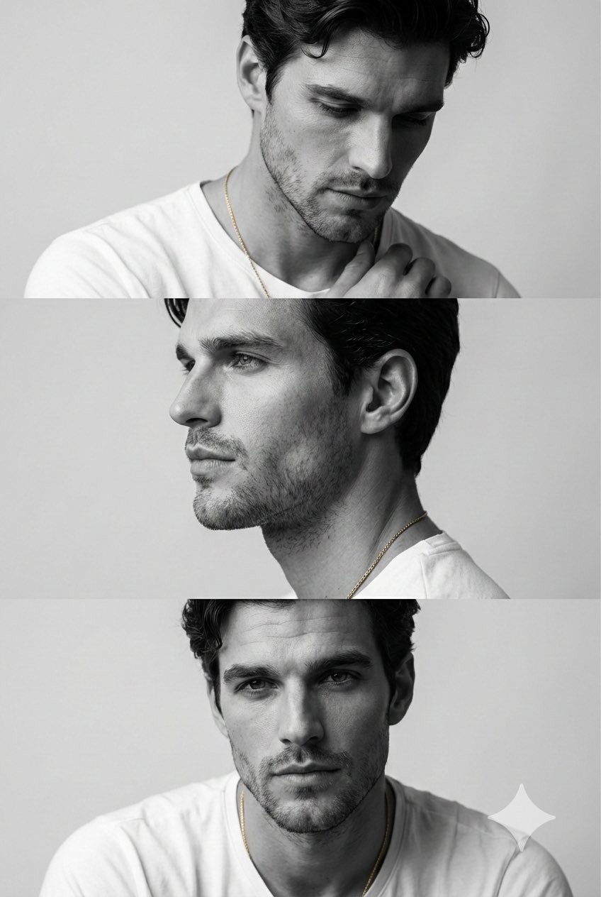 CopyPreserve the face, proportions, and external features of the model as in the reference. A minimalist monochrome fashion editorial triptych featuring three stacked cinematic frames. The subject is a young man with short dark hair and a groomed beard. Frame 1: Emotional and introspective, looking downward with a hand near the collarbone, highlighting bone structure with Rembrandt lighting. Frame 2: A crisp profile shot with a focus on the nose, lips, and masculine jawline, gaze directed slightly upward. Frame 3: A frontal, thoughtful portrait with shoulders relaxed and direct eye contact. The composition is clean and modern, using a white T-shirt and gold necklace for visual continuity. Commercial magazine quality, high-end mirrorless camera, authentic skin pores, soft bokeh, and elegant masculinity.