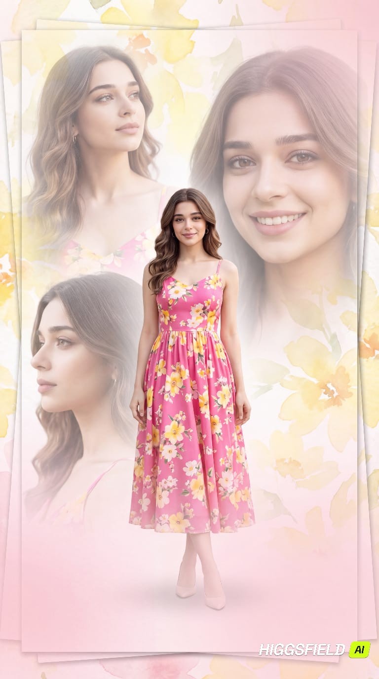 CopyA beautiful multi-layered photo collage featuring the a girl from the reference image. The central full-length shot shows her in her bright Pink floral print dress. Surrounding her are three ethereal, faded portraits: one large close-up of her smiling, one looking away gracefully and a side profile. The background is decorated with soft watercolor yellow and white floral patterns to match her dress. The overall aesthetic is soft, dreamlike,