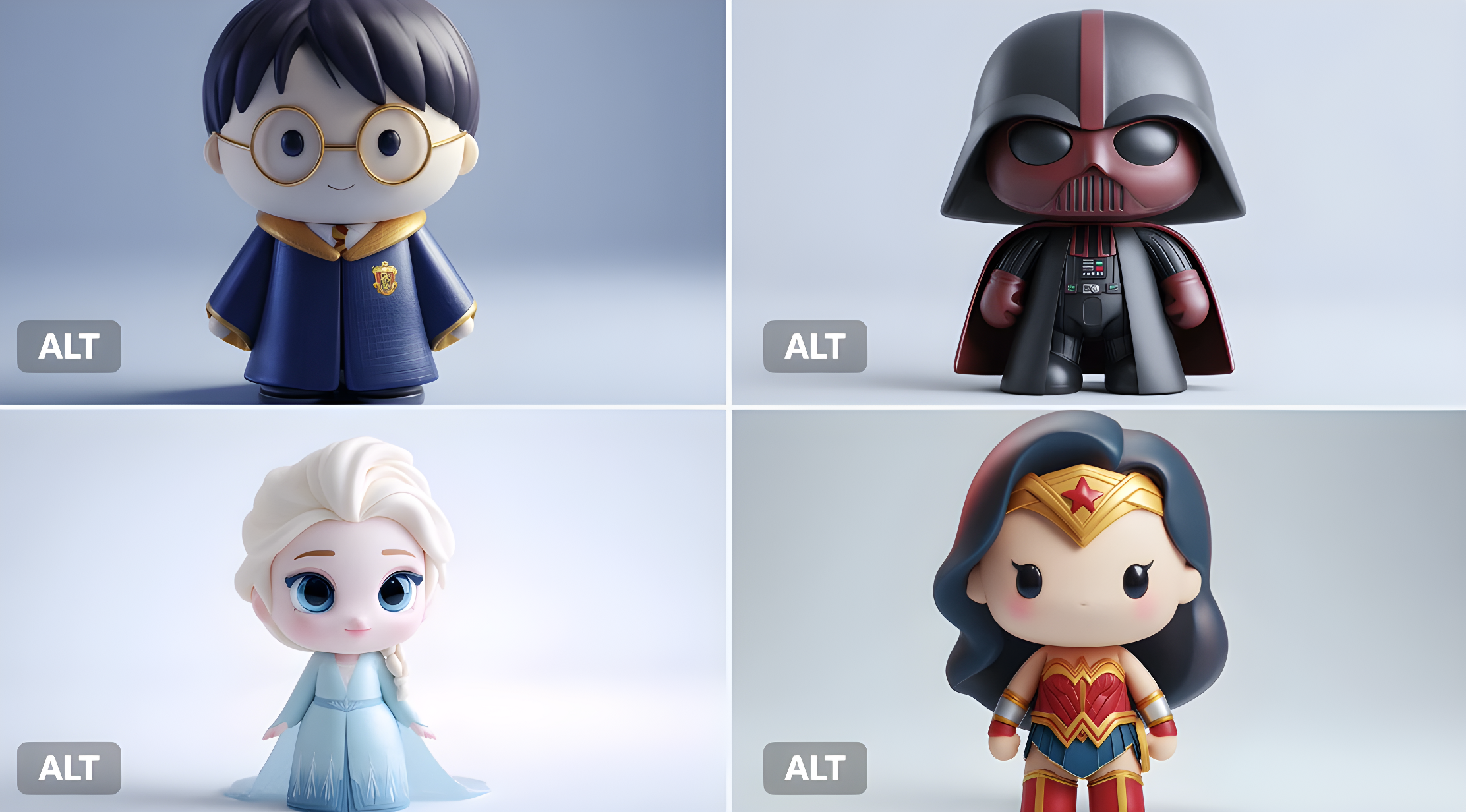 CopyChibi-style 3D vinyl toy of [subject], rendered in [color1] and [color2] tones, front-facing on a white background. Minimalist composition with soft shadows, oversized head and tiny body proportions, clean OC renderer output in Cinema 4D. Toy-like shine and playful charm.