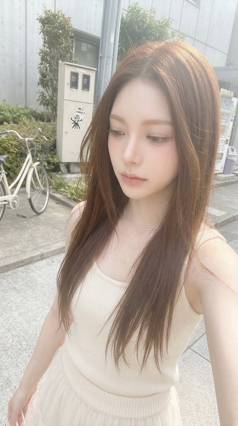 CopySOFT STREET HAZE cashmere blonde long straight hair with soft natural flow, subtle inner layering, lightly parted with gentle face-framing strands outfit: ivory ribbed sleeveless knit top with a clean fitted silhouette, layered cream tulle midi skirt with airy volume and soft transparency