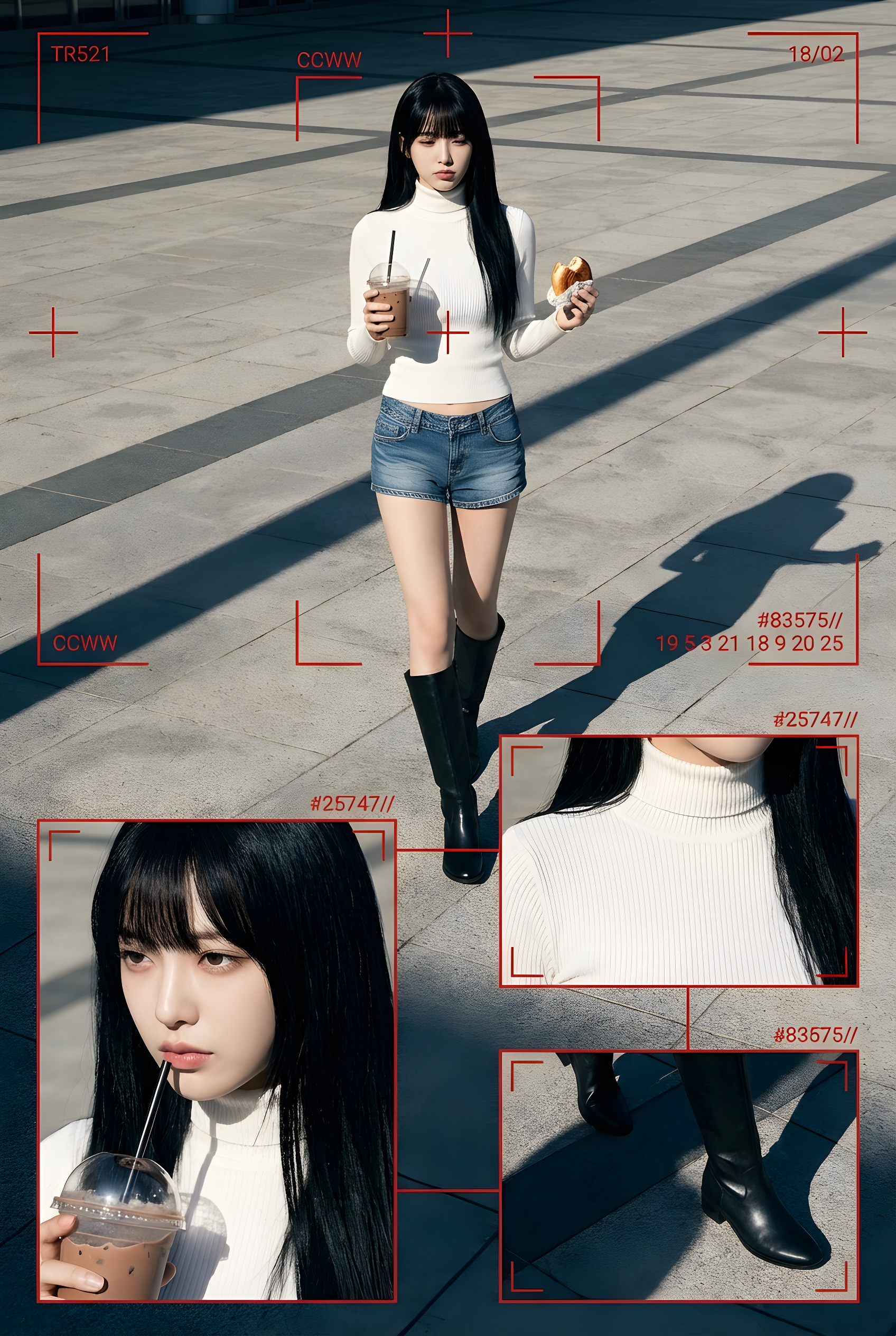 CopyA cyber-grunge surveillance-style fashion editorial featuring a young, beautiful, cute Japanese woman in her early 20s, with large expressive eyes and K-pop idol–inspired makeup. Her makeup highlights flawless radiant skin, soft shimmer around the eyelids, sharp eyeliner, and glossy lips, giving a refined feminine glow. She has long, sleek black hair with perfectly trimmed bangs, smooth texture, and soft highlights, flowing naturally behind her as she walks. Her outfit consists of a fitted rib-texture turtle-neck knit top and denim short pants with visible stitching details, slightly low-rise styling, giving a modern Japanese Y2K street flavor. She wears long sleek boots—clean, structured, and stylish—adding elegance and contrast to her exposed legs. Accessorized with a small gold pendant necklace. She holds an iced chocolate/coffee cup with a straw in her left hand and a half-eaten pastry in her right hand. Her body posture is mid-stride, full-body captured, facing slightly off-center, head angled down slightly with a cool, indifferent expression—visually as if caught candidly by a high-end surveillance system monitoring an urban location. Scene environment: A bright late-afternoon plaza with paved concrete tiles. Highly directional sunlight creates long diagonal shadows, deep blacks under the boots, and warm atmospheric highlights. The tone feels cinematic but raw, like real street documentation. Technical image style: Hyper-real 8K Ultra-HD clarity, deep focus across full frame, dramatic daylight contrast, color palette composed of urban greys, pure whites, deep blacks, and striking crimson UI overlay accents. 1440 × 1920 resolution, 4:5 editorial framing. Layout structure: Editorial collage combining: ● one large main full-body walking shot + ● three cropped secondary frames: — close-up of face + makeup styling + drink hand — torso crop featuring turtle-neck knit texture — boot-and-legs detail with pavement shadows These cropped windows connect visually via red surveillance-style vector lines. UI Overlay Components: · thin red bounding rectangles · telemetry-like ID codes · crosshair alignment marks · vector targeting lines · timecode print · numeric encryption motifs Example printed graphics: “TR521” “CCWW” “18/02” “#25747//” “#83575//” “19 5 3 21 18 9 20 25” Atmospheric concept: Modern cyber-grunge × candid street-watching × dystopian fashion documentation. Feels like a digital observation archive rather than posed photography. A stylish mystery aura, privacy-invasion chic, cinematic realism. Camera Specifications: Shot from a slightly high-angle perspective, around 35–50mm focal length, long daylight-cast shadows visible, crisp texture on concrete paving, deep-focus realism.