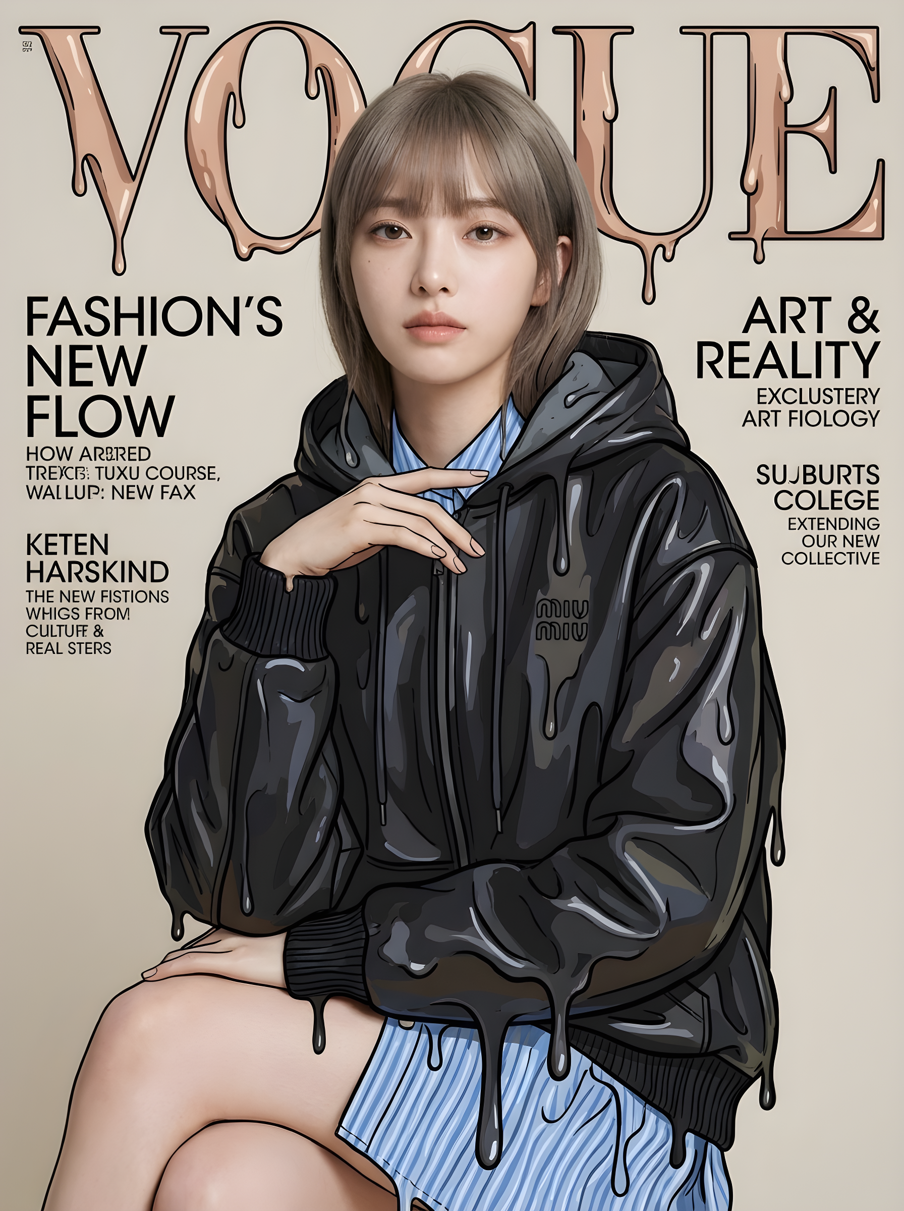 CopyCreate a high-fashion magazine cover. FORMAT: Vertical portrait, editorial composition, clean layout. SUBJECT: Use the uploaded reference image as the ONLY human subject. Preserve identity strictly. The face, skin, hands, and legs must remain fully photorealistic. Natural skin texture, realistic lighting. NO illustration or stylization on any skin areas. CLOTHING: All clothing must be fully illustrated, not photographic. Bold black ink outlines. Flat yet expressive color fills. Liquid, melting paint texture with glossy drips. Illustration integrates seamlessly with the real skin but never overlaps it. LIQUID BEHAVIOR: Viscous, gravity-driven paint drips. Organic flow, uneven edges. Liquid overlaps clothing only, never skin. TYPOGRAPHY: Large magazine title at the top: {{MAGAZINE_TITLE}}. Title and text rendered as illustrated graphic elements. High-fashion serif style, slightly imperfect edges. Typography visually belongs to the illustration layer. BACKGROUND: Clean, neutral background with soft tones. MOOD: Editorial, bold, surreal yet refined. Feels like a real magazine cover with illustrated fashion intervention.