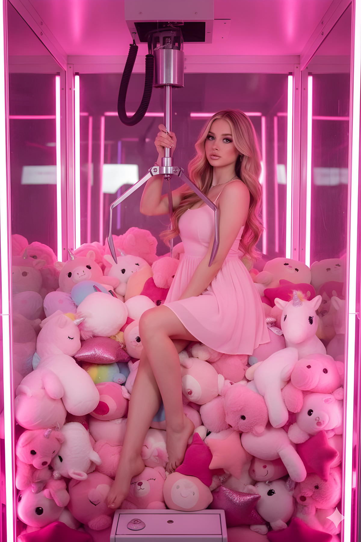 Copy{"prompt": "beautiful young western woman with long blonde wavy hair, glamorous makeup, full lips, seductive playful expression, wearing short light pink flowy summer dress, sitting elegantly on the giant metallic claw of a claw machine, holding onto the claw hook with one hand, legs dangling playfully, barefoot, surrounded by enormous pile of adorable fluffy pink teddy bears, pink unicorns with rainbow manes and sparkly horns, pastel plush toys everywhere, inside a giant transparent glass claw machine booth with bright pink neon glowing interior, dreamy soft pink lighting, magenta and baby pink color palette, cute kawaii aesthetic mixed with glamorous fashion, surreal playful fun vibe, ultra detailed, cinematic lighting, high resolution, photorealistic with dreamy soft focus, 8k"}