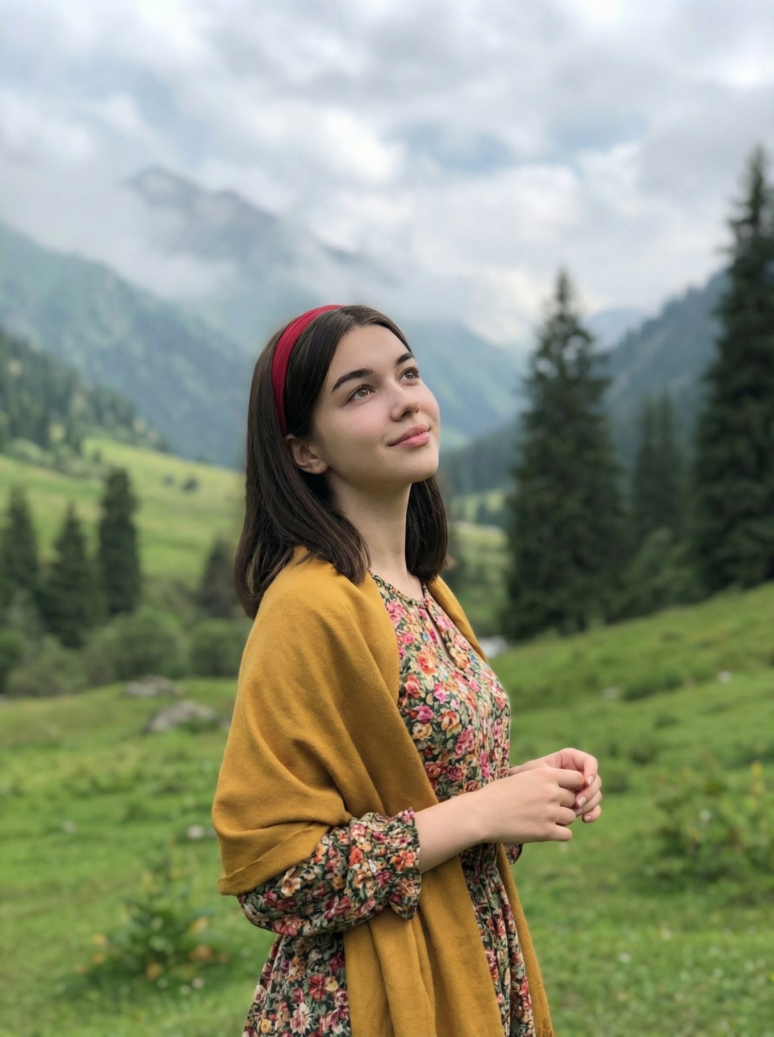 Copy{ "image_generation": { "subject": { "description": "young woman standing in a lush green mountain valley", "pose": "standing naturally with hands gently together, looking slightly upward", "expression": "calm, peaceful, soft smile", "gaze": "looking toward the sky" }, "appearance": { "hair": { "color": "dark brown", "style": "straight, shoulder-length with a red headband" }, "face": { "skin_tone": "fair and natural", "makeup": "minimal, natural makeup" } }, "outfit": { "top": "traditional patterned dress with colorful floral design", "outerwear": "mustard yellow shawl draped over shoulders" }, "environment": { "setting": "green mountainous landscape", "background_elements": [ "rolling green hills", "tall pine trees", "misty mountains", "cloudy sky", "grassy field" ] }, "lighting": { "type": "natural outdoor light", "quality": "soft and diffused", "time": "daytime" }, "camera": { "angle": "eye-level", "framing": "mid shot", "depth_of_field": "moderate, background softly blurred" }, "aesthetic": { "style": "natural lifestyle photography", "vibe": "peaceful, fresh, scenic", "color_palette": "green, mustard yellow, earthy tones" }, "quality": { "resolution": "high", "realism": "photorealistic", "detail": "high detail" } } }