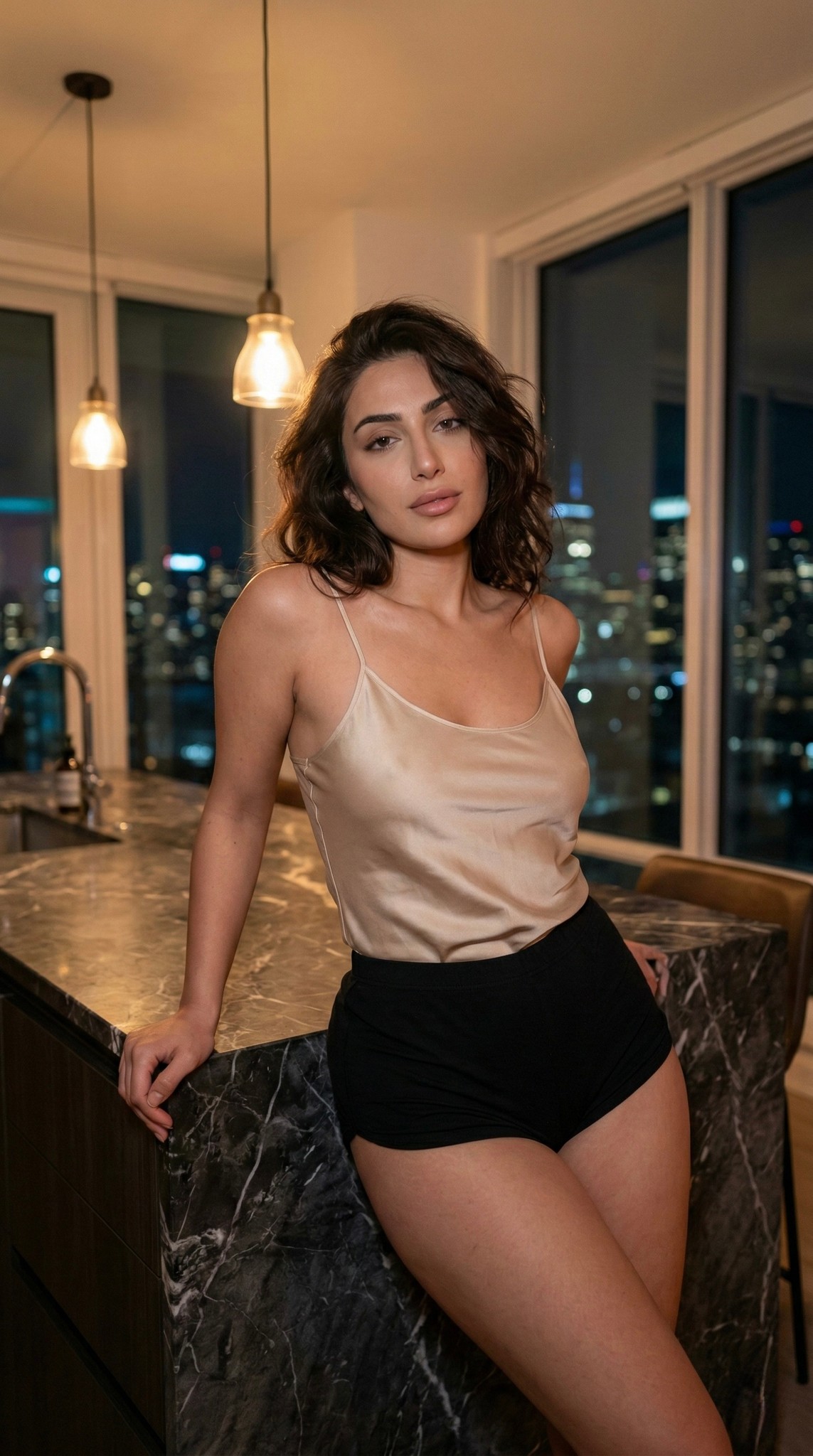 Copy{ "meta": { "camera": "iPhone 17 Pro", "lens": "35mm", "aspect_ratio": "9:16", "time_of_day": "11:38 PM", "lighting_temperature": "warm tungsten 3400K with subtle neon spill", "style": "low-light iPhone realism, natural HDR, slight handheld motion, authentic skin texture, shallow depth of field" }, "scene": { "location": "modern penthouse kitchen", "atmosphere": "late-night alone energy, city lights outside floor-to-ceiling windows", "background": [ "dark marble kitchen island", "dim pendant lights glowing warm", "blurred skyline bokeh through glass" ] }, "subject": { "age": "late 20s (clearly adult)", "ethnicity": "Persian / Middle Eastern", "body_type": "curvy hourglass, heavy chest, tiny waist, round hips", "hair": "dark brown, loose messy waves", "pose": { "position": "leaning back against marble island", "hips": "subtly pressed to counter", "shoulders": "slightly rolled back", "one_hand": "resting on countertop edge", "expression": "slow eyes, lips softly parted, confident calm" } }, "outfit": { "top": "thin satin champagne-colored slip top, braless, natural drape tension", "bottom": "high-cut black lounge shorts, hugging hips" }, "camera_details": { "angle": "slightly below chest level", "distance": "medium shot", "focus": "sharp on face and collarbones, background softly blurred", "imperfections": "tiny highlight bloom from pendant lights" } }
