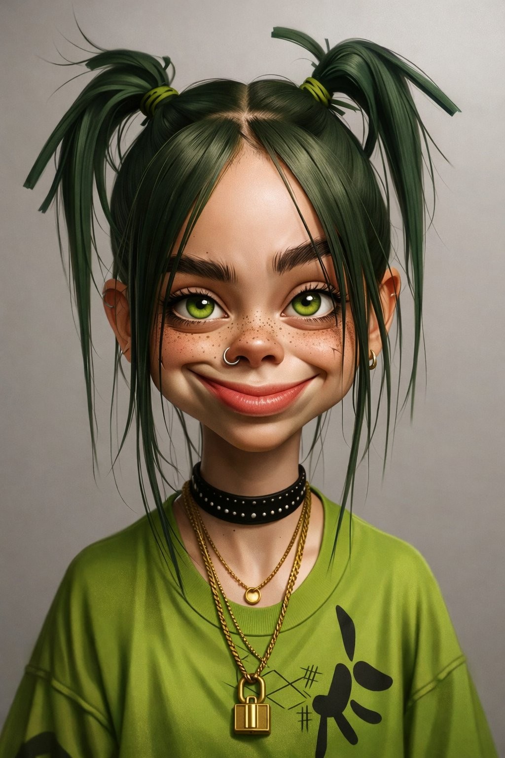 Copy{ "image_type": "3D-rendered digital portrait", "resolution_target": "8K", "aspect_ratio": "3:4", "camera_framing": { "shot_type": "medium close-up", "orientation": "vertical", "subject_position": "subject occupies center-left frame", "crop": "head to upper torso visible" }, "camera_angle": { "head_pose": "three-quarter profile", "face_direction": "turned to the viewer's right", "eye_direction": "looking slightly toward the camera" }, "subject": { "gender_presentation": "female", "age_appearance": "young adult", "skin_tone": "light skin tone", "facial_features": { "face_shape": "slightly elongated with soft contours", "eyes": { "color": "green", "shape": "large, rounded" }, "eyebrows": "dark, thick, naturally arched", "nose": { "piercing": "silver hoop nose ring on left nostril" }, "mouth": { "expression": "subtle smirk" }, "freckles": "visible freckles across nose and cheeks" } }, "hair": { "color": "dark green", "style": "two high pigtails", "parting": "center part", "texture": "smooth with loose flyaway strands" }, "clothing": { "top": { "type": "oversized t-shirt", "color": "green", "fit": "loose" } }, "lighting": { "type": "soft studio lighting", "direction": "front-left", "shadows": "gentle shadows defining facial contours" }, "background": { "color": "neutral light gray", "texture": "smooth gradient" }, "render_style": { "style": "semi-realistic 3D character render", "skin_detail": "highly detailed skin texture", "overall_finish": "AI-generated, ultra-clean look" }, "quality_tags": ["ultra-detailed", "8K", "high sharpness", "cinematic lighting", "professional 3D render"] }