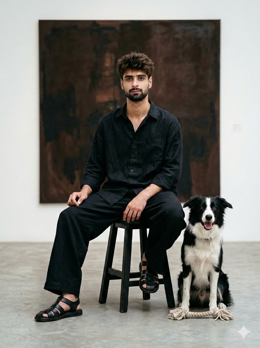 CopyA highly detailed minimalist art gallery portrait of this young man with fair skin, sharp cheekbones, medium beard, tousled light brown wavy hair, and a calm, introspective gaze directed at the camera, sitting relaxed on a simple black wooden stool with legs crossed in a bright, empty white-walled contemporary art space. He wears an oversized black linen button-up shirt tucked loosely into matching wide-leg black trousers, black socks, and open-toe black leather gladiator-style sandals. At his feet lies a friendly black-and-white border collie mix dog with tongue out, panting happily, next to a small woven rope toy on the smooth concrete floor. Directly behind him hangs a massive square abstract painting with rich earthy brown tones, subtle texture, and deep shadowy gradients dominating the wall. The overall style is sophisticated contemporary fashion editorial photography, soft natural diffused daylight with gentle shadows emphasizing fabric textures, dog fur, and paint surface, realistic.