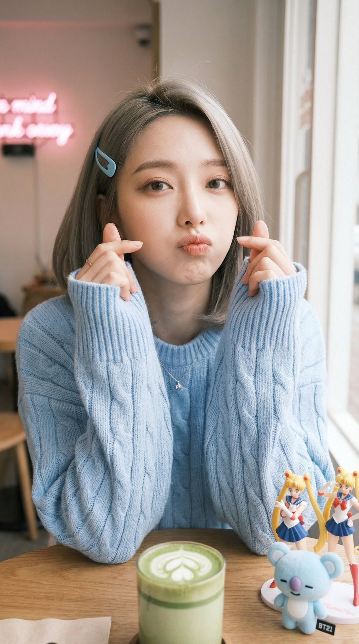 Copy{ "portrait_prompt": { "subject": { "description": "Based on <User Portrait>, a young woman with playful cute expression, both hands making mini finger heart gestures near her face, pouty duck lips, head slightly tilted, looking up at camera with aegyo charm", "features": { "hair": "hair with subtle highlights, light blue snap hair clip on left side", "eyes": "Big sparkling doe eyes looking upward at camera, soft brown eyeshadow", "expression": "Playful pouty duck face, slightly pursed coral lips, rosy pink blush on cheeks, mischievous cute vibe", "makeup": "Korean ulzzang style - emphasized rosy blush, gradient coral lips, natural brows, dewy skin" }, "pose": "Seated at cafe table, both hands raised near face level making mini finger heart gestures (thumb and index finger tips touching), elbows resting on table, shoulders slightly raised in cute shrug" }, "attire": { "type": "Based on user-uploaded clothing reference", "details": [ "Light blue cable knit oversized sweater", "Wide boat neckline exposing collarbones", "Chunky knit texture visible", "Silver chain necklace with small pendant", "Multiple delicate rings" ], "color": "Soft baby blue" }, "composition": { "shot_type": "Medium close-up, upper body portrait", "focal_length": "35-50mm", "camera_angle": "Elevated overhead angle, camera positioned above eye level looking down at subject, boyfriend/girlfriend POV selfie angle", "camera_height": "Above subject's head height, shooting downward", "framing": "Subject centered, table surface and props visible in lower portion of frame" }, "lighting": { "type": "Soft diffused natural window light", "direction": "From right side and slightly behind, wrapping around face", "mood": "Bright airy cafe lighting, soft shadows under chin, even illumination on face" }, "color_palette": { "film_simulation": "ASTIA", "style": "Fujifilm ASTIA inspired color grading, soft creamy skin tones, pastel color harmony, low contrast, gentle highlight rolloff, slightly desaturated dreamy feel", "tones": ["Baby blue", "Cream white", "Soft pink", "Pastel mint accents"] }, "environment": { "setting": "Kawaii aesthetic cafe with anime/Popmart collectibles", "background": "White wooden panel walls, pink neon sign (blurred 'something' text), doorway/mirror reflection showing cafe interior", "table_props": { "left_side": "Sailor Moon anime figurines - Sailor Venus (blonde) and Sailor Mercury (blue hair) in sailor uniforms, standing poses", "center": "Matcha latte with heart latte art in clear glass cup on turquoise saucer", "right_side": "Small blue Popmart-style toy figure (BT21 Koya koala character)" }, "atmosphere": "Cute otaku cafe date aesthetic, collectible figurines display" }, "mood": "Playful aegyo, sweet mischievous charm, Korean cafe date selfie vibe, girlfriend material", "technical_tags": [ "8K", "photorealistic", "overhead angle", "shallow depth of field", "soft skin texture", "natural beauty", "instagram aesthetic" ], "character_reference": "Based on user-uploaded character reference", "clothing_reference": "Based on user-uploaded clothing reference", "negative_prompt": "Eye-level shot, looking down, harsh shadows, orange skin, heavy contour, serious expression, flat angle" } }