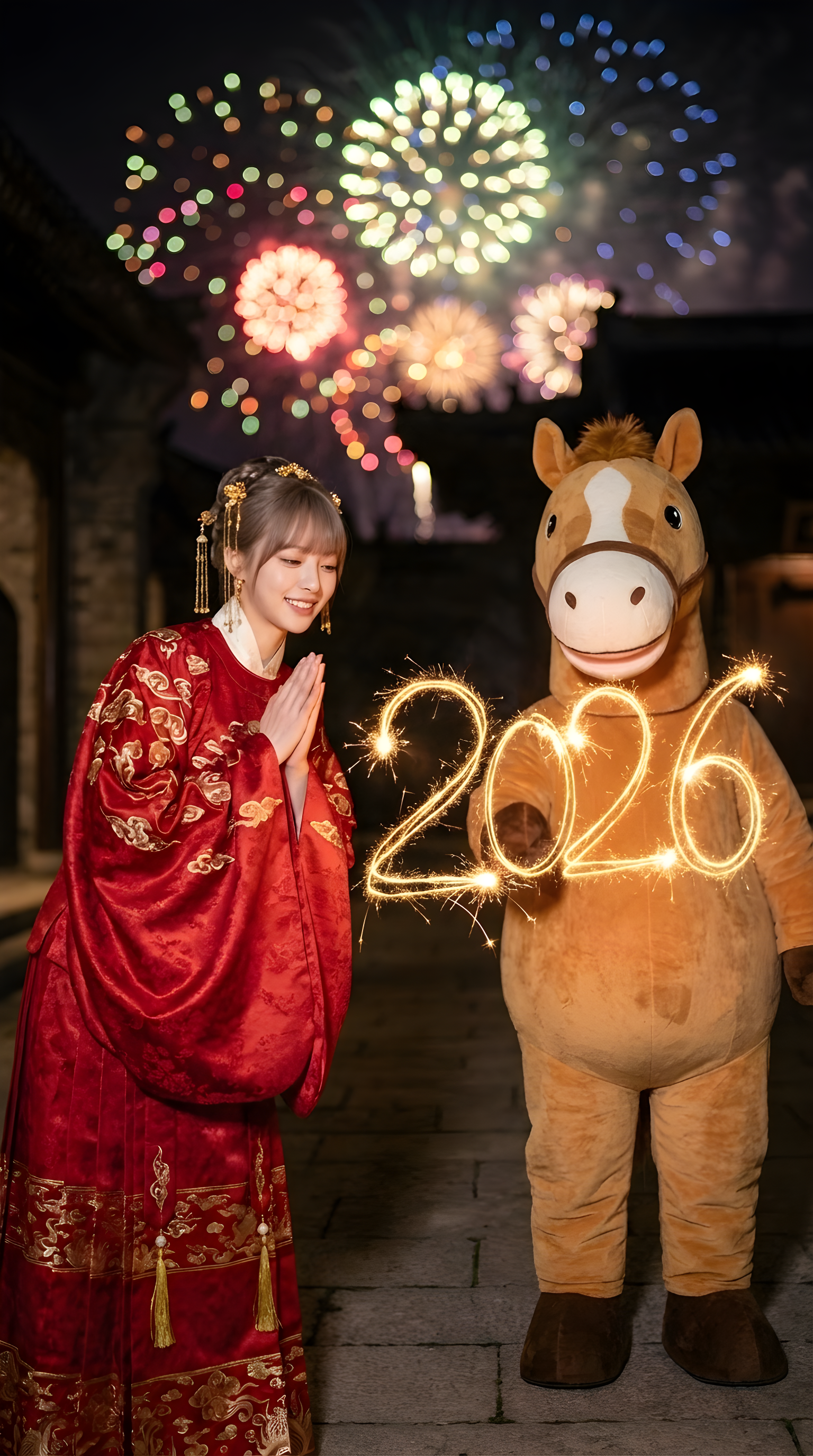 CopyCHARACTER_CORE Scene: open courtyard night, photoreal fireworks bokeh. Horse element: HORSE_MASCOT_CORE holding a sparkler, drawing glowing strokes in the air. Year element: glowing strokes form “2026” (if text fails, make it abstract light trails that you replace later). Interaction: she looks at the glowing trails with delighted expression, hands clasped greeting. Camera: 50mm, long exposure feel for light trails, subject sharp. MIX_MEDIA_INTEGRATION She wears authentic Ming dynasty hanfu: aoqun + mamianqun (horse-face skirt), stand collar, pipa sleeves, embroidered gold-thread cloud patterns, rich red silk with subtle brocade, gold hairpins and tassels, elegant and festive.