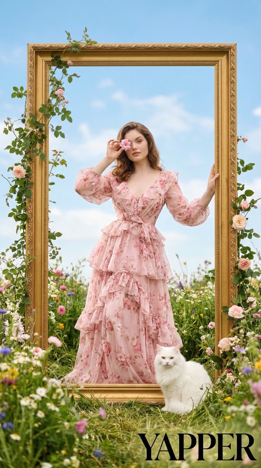 CopyUltra-realistic surreal fashion scene of an elegant woman posing inside a large ornate golden picture frame standing in a lush wildflower garden. The frame is decorated with climbing greenery and small blooming flowers. She wears a romantic pink floral couture dress with ruffles and delicate fabric layers. One hand gently holds a pink flower near her eye while she poses gracefully. A fluffy white cat sits beside her on the grassy floral platform.Behind the frame a bright blue sky with soft clouds completes the dreamy scene. Camera: cinematic fashion shot Lens: 50mm Lighting: natural daylight with soft highlights Composition: subject framed perfectly inside golden frame Depth of field: soft natural background blur Aspect ratio 9:16