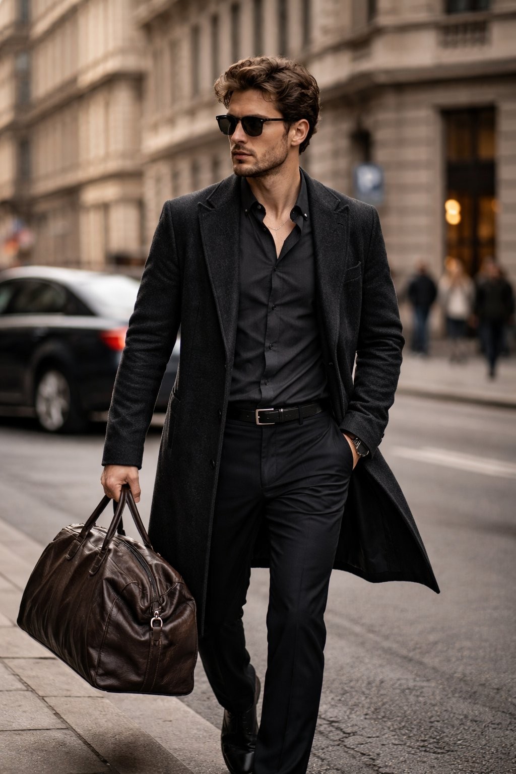 CopyA medium-full-length photograph captures a man walking purposefully down a city street. He has wavy brown hair, wears dark sunglasses, and a serious expression, looking toward his left. His attire consists of a long, dark grey wool coat over a charcoal grey button-down shirt, a dark belt, and black trousers with black shoes. In his right hand, he holds a large, wrinkled dark brown leather duffel bag. The background features a blurred, moving black car and classic stone buildings, suggesting motion and an urban environment.