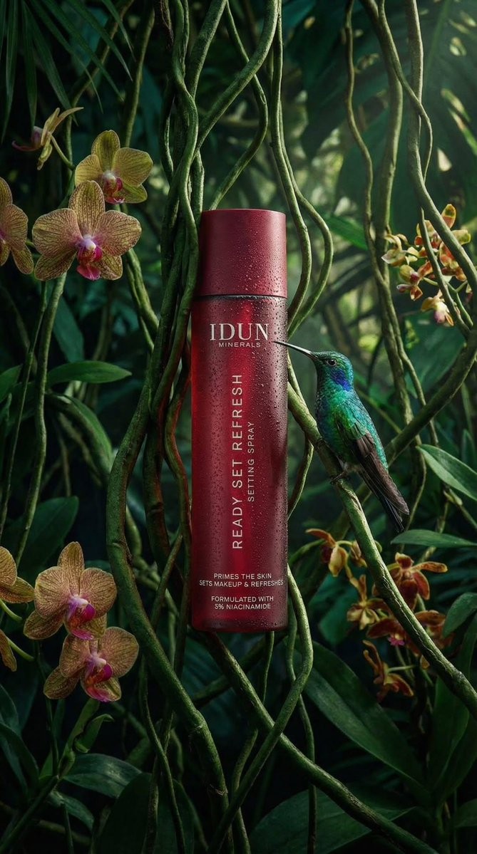 Copy{ "subject": { "primary": "Cosmetic spray bottle", "secondary": "Hummingbird", "brand": "IDUN MINERALS", "product_name": "READY SET REFRESH" }, "packaging": { "form_factor": "Cylindrical bottle", "component_parts": [ "Main body", "Cap (flush with body)" ], "material_appearance": "Matte finish, likely plastic or coated metal", "condition": "Pristine, new", "reflections": "Vertical highlight on the left side, mirrored reflection in water below" }, "label_design": { "type": "Direct print onto bottle", "layout_orientation": "Mixed (Horizontal brand/details, Vertical product name)", "typography": { "font_family": "Sans-serif", "casing": "All uppercase", "style": "Clean, minimalist", "alignment": "Left aligned relative to the vertical axis for product name, centered horizontally for brand" } }, "text_visible": { "brand_header": ["IDUN", "MINERALS"], "body_vertical": ["READY SET REFRESH", "SETTING SPRAY"], "footer_details": ["PRIMES THE SKIN", "SETS MAKEUP & REFRESHES", "FORMULATED WITH", "3% NIACINAMIDE"], "reflection_text": "Inverted mirror image of all text visible on the water surface" }, "colors": { "packaging_base": "Deep red / Burgundy", "text": "White", "foliage": ["Deep emerald green", "Forest green", "Moss green"], "hummingbird": ["Iridescent green (head/back)", "Dark grey/brown (wings)", "Reddish/pink (tail feathers)", "Black (beak)"], "water": "Dark, almost black with reflections" }, "materials": { "bottle": "Matte rigid material", "environment": ["Liquid water", "Moss", "Fern leaves", "Palm-like leaves"], "biological": "Feathers (bird)" }, "human_elements": { "visible": false }, "environment": { "setting": "Simulated rainforest or jungle floor", "foreground": "Still water surface", "midground": "Mossy bank, bottle placement", "background": "Dense tropical foliage" }, "lighting": { "quality": "Soft, moody, atmospheric", "direction": "Side lighting from left (creating highlight on bottle)", "shadows": "Soft shadows in the foliage, dark water providing high contrast reflection", "highlights": "specular highlight on hummingbird head, diffuse highlight on bottle curve" }, "camera": { "angle": "Eye-level with water surface", "framing": "Vertical portrait", "focus": "Sharp focus on bottle and hummingbird", "depth_of_field": "Shallow (background leaves are blurred/bokeh)", "composition": "Rule of thirds (bottle on left third line, bird entering from right)" }, "style": { "category": "Product photography", "theme": "Nature, Organic, Eco-luxury", "mood": "Serene, fresh, premium" } }