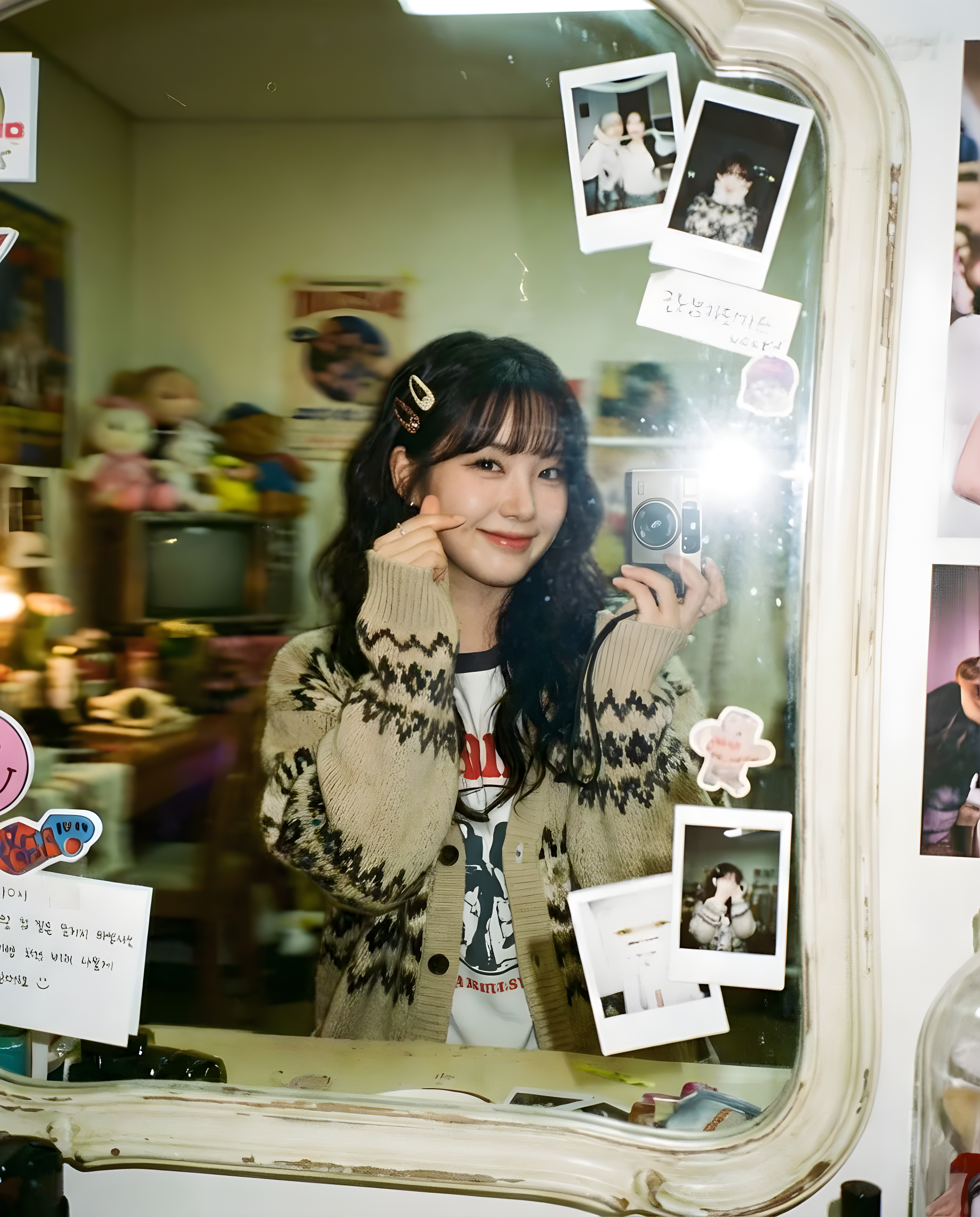 Copyversion 14.1_retro_dynamic_fingerheart, objective 90s Lo-Fi Film Portrait with Panning Motion, aspect ratio 4:5, rendering engine Analog Film Simulation, fidelity tier Raw Scan / Texture Rich, special technique Slow Shutter Panning + Flash Freeze, subject Young cute Korean K-pop idol, archetype Pure / Fresh face / Innocent charm, gaze sweet, engaging eye contact with the mirror reflection, expression gentle warm smile, making a small finger heart gesture (thumb and index finger crossed) near her cheek, makeup light, youthful "fruit juice" makeup style with glossy lips, hair soft, dark, wavy with cute bangs, accessory colorful retro hair clips or scrunchie visible, wardrobe oversized vintage colorful knit cardigan worn over a cute graphic baby tee, style Y2K / 90s cozy retro cute, props large vintage wall mirror with an ornate, slightly worn frame, mirror covered with cute stickers, polaroids, and handwritten notes, foreground blurry retro items suggesting a messy teen room (plushies, colorful cups), environment cozy, cluttered backstage dressing room or bedroom, vibe nostalgic, intimate, warm, chaotic cute, illumination on-camera direct flash (point-and-shoot style), shadows harsh, defined flash shadows behind the subject, highlights bright specular reflection of the flash bulb visible in the mirror, shot type medium portrait capturing reflection, photographer not visible, lens simulation 35mm compact film camera lens, motion effect significant horizontal motion blur (panning streaks) on background and edges, subject relatively frozen by flash, film stock Fuji Superia 800 / Kodak Portra 400 (Pushed), noise heavy, visible film grain and color noise, color grading lo-fi, warm greenish tint typical of cheap film scans, vibrant reds and yellows, artifacts light leaks, dust specks, vignetting from flash fall-off