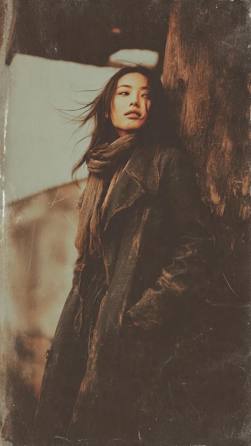 CopyA gritty, classic portrait of a beautiful Japanese woman standing under soft, fading sunlight, leaning against an old, weathered tree. Her long, dark hair flows in the breeze, adding to the raw, natural aesthetic. She wears a worn-out scarf and a vintage, oversized coat, evoking a grunge vibe. The background features blurred, industrial elements with a slightly distressed urban feel. The image carries a muted, nostalgic film quality, with deep shadows and soft lighting, creating a moody, introspective atmosphere, reminiscent of 90s grunge fashion and photography