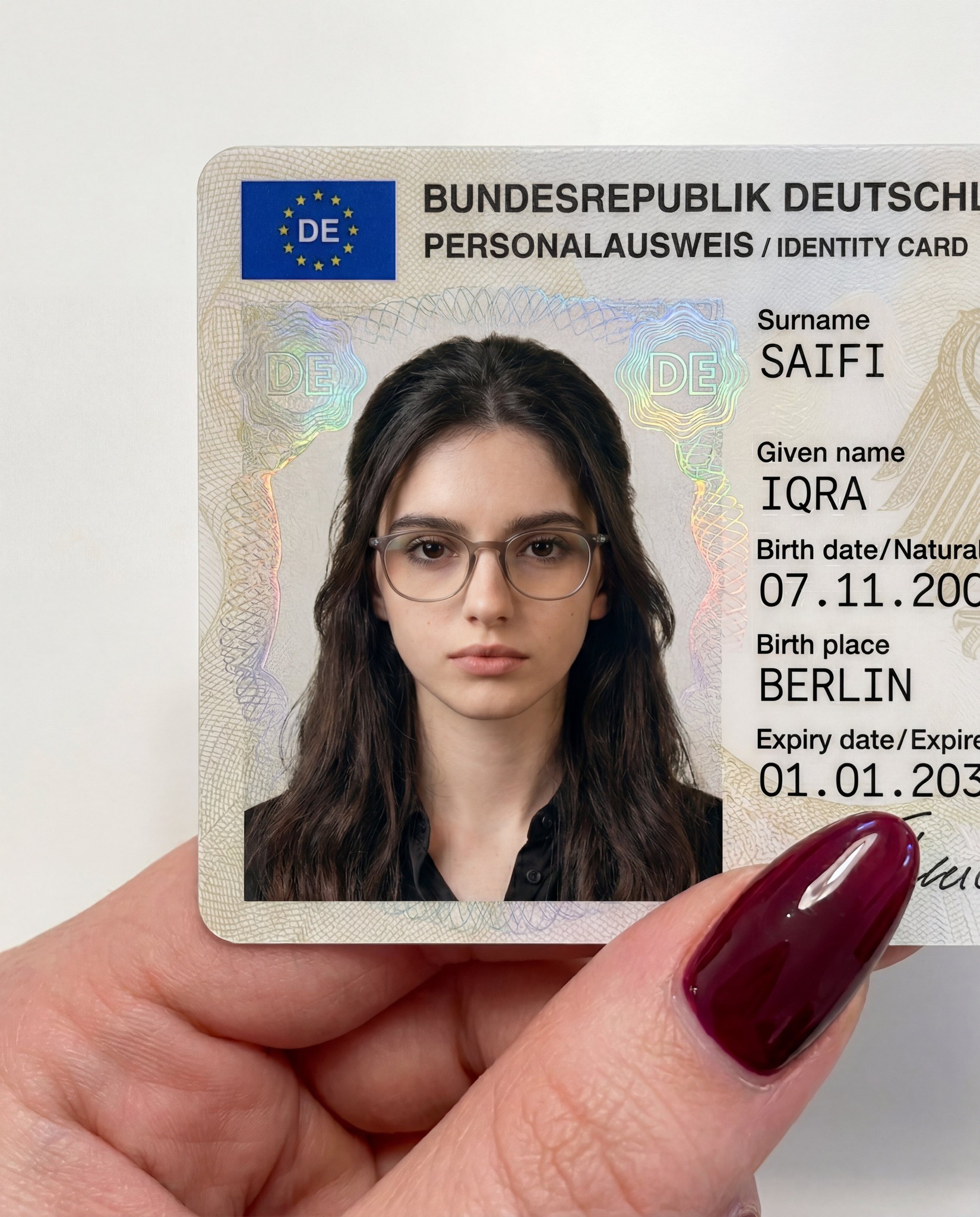 Copy{ "type": "Close-up photography", "subject": "German National Identity Card (Personalausweis) held by a hand", "card_content": { "header_text": "BUNDESREPUBLIK DEUTSCHLAND / PERSONALAUSWEIS / IDENTITY CARD", "logo": "Blue EU flag box with 'DE' country code in the top left", "portrait": { "appearance": "Young woman with long, straight blonde hair parted in the middle", "facial_features": "Fair skin with prominent natural freckles across the nose and cheeks, neutral expression, hazel/green eyes looking directly forward", "clothing": "Black top with a visible neckline", "accessories": "Small silver stud earrings visible on earlobes" }, "text_data": { "surname": "SAIFI", "given_name": "IQRA", "birth_date": "07.11.2[cut off]", "birth_place": "BERLIN", "expiry_date": "01. [cut off]" }, "surface_texture": "Glossy laminate with visible holographic security patterns (guilloche lines) overlaying the portrait and text" }, "foreground_hand": { "position": "Holding the bottom right corner of the card", "skin_tone": "Fair/Light", "fingernail": "Thumb visible with a long, almond-shaped nail painted in a glossy, deep burgundy or dark red color" }, "background": "Plain, solid white surface", "lighting": "Soft, even indoor lighting creating slight reflections on the card's surface and the glossy nail polish", "framing": "Top-down, vertical close-up shot focused entirely on the card and the thumb" }