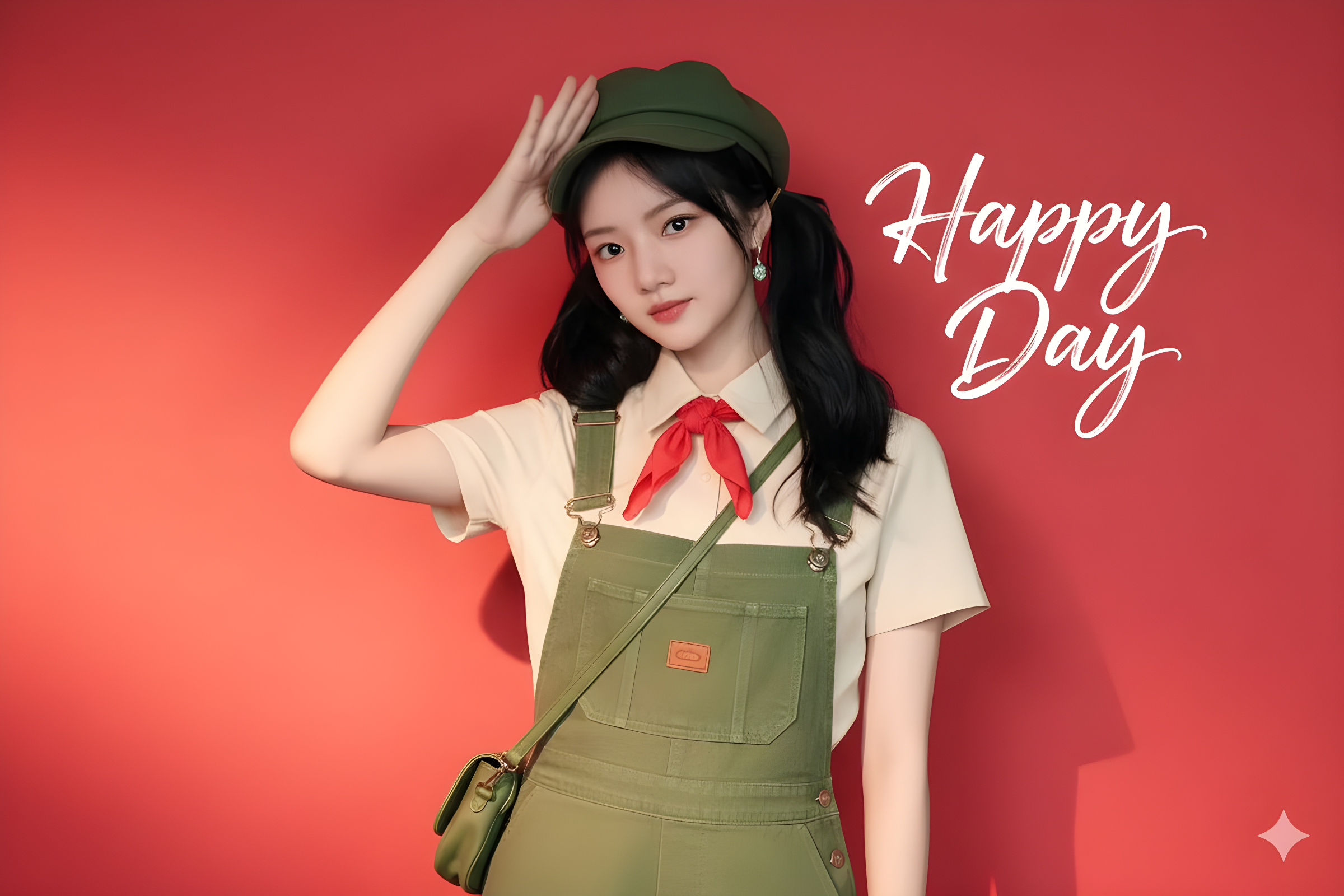 CopyKeep the character's facial features and pose unchanged, and generate a fresh portrait: the character wears a beige short-sleeved shirt paired with green overalls, a green retro newsboy cap, a small red neckerchief, a green crossbody bag, and white socks. Change the background to solid red, with calligraphy-style English text "Happy Day" in the upper right, integrating the text around the character. The lighting should be soft and even.