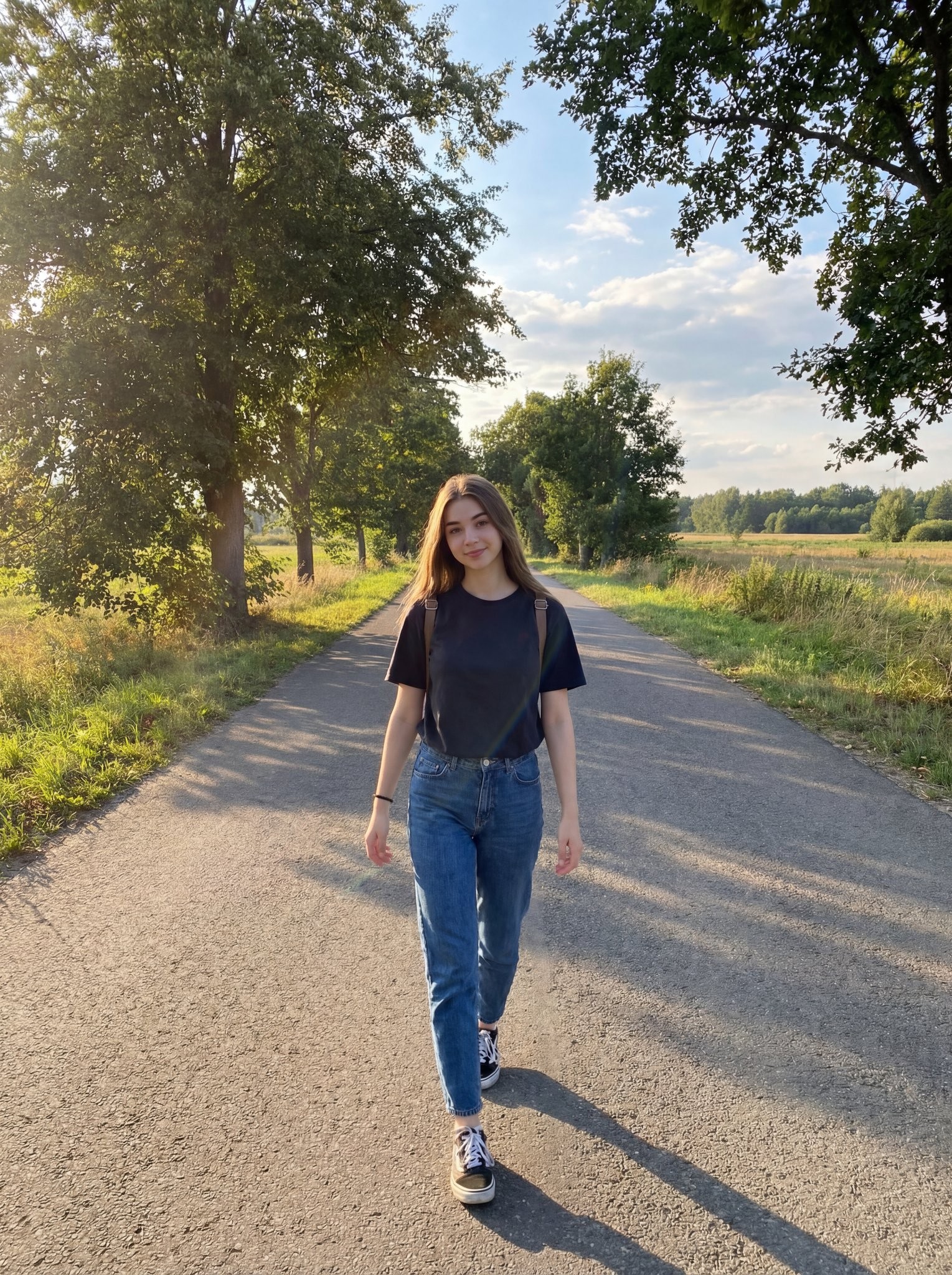Copy{ "image_generation": { "subject": { "type": "young woman", "pose": "walking naturally toward the camera on a quiet country road", "expression": "soft gentle smile, relaxed and confident", "gaze": "looking directly at the camera" }, "appearance": { "hair": { "color": "light brown", "style": "long straight hair, naturally flowing" }, "skin": { "texture": "natural realistic skin", "tone": "soft warm tone" } }, "outfit": { "top": "simple black t-shirt", "bottom": "blue denim jeans", "footwear": "black canvas sneakers with white laces", "accessories": "minimal, casual everyday look" }, "environment": { "location": "peaceful countryside road surrounded by green trees and open fields", "season": "summer", "time_of_day": "golden hour, late afternoon", "sky": "soft blue sky with light clouds" }, "lighting": { "type": "natural sunlight", "direction": "warm sunlight coming from the side, creating soft shadows", "effect": "golden glow, soft highlights, realistic outdoor lighting" }, "camera": { "angle": "eye-level, full-body shot", "style": "natural lifestyle photography" }, "aesthetic": { "mood": "peaceful, fresh, natural", "color_palette": "warm greens, golden sunlight, natural tones" }, "quality": { "resolution": "high detail", "render": "photorealistic" } } }
