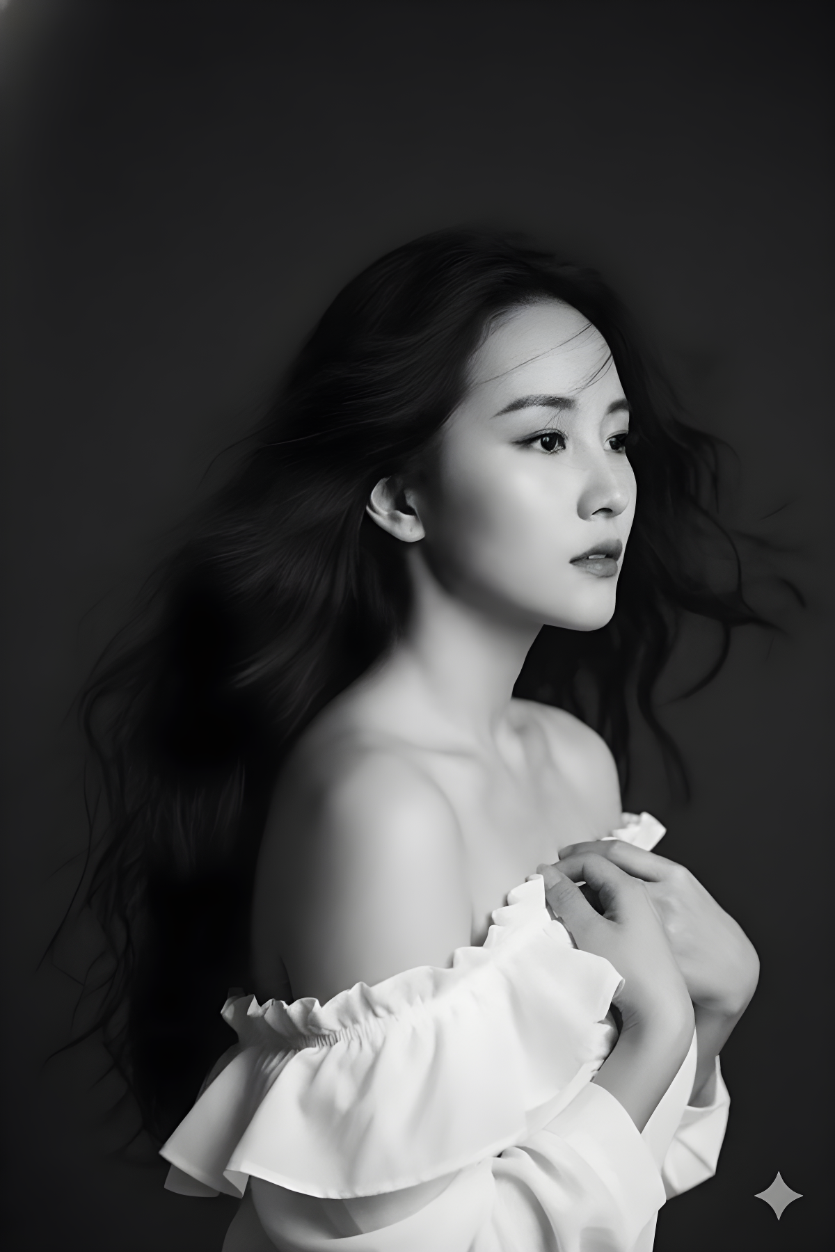 CopyCreate and don't change her face. A highly artistic 90s vintage black and white (monochrome) portrait. It features a beautiful woman with classic facial features and long, voluminous, wavy, wind-blown black hair. She gazes off to the side with a pensive, poetic look. The woman holds a piece of ruffled white fabric or clothing against her chest, her shoulders wide open (off-shoulder). The plain, dark background provides a sharp contrast to her skin and white clothing. The image texture has a very pronounced film grain, a 35mm film aesthetic, and soft lighting that accentuates the cheekbones and hair texture. Masterpiece quality, 8k, emotional, and cinematic.