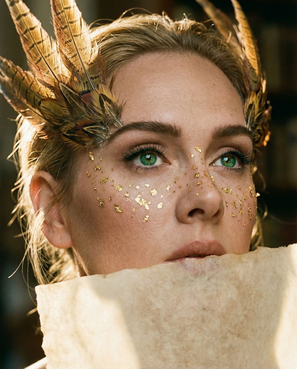 Copy{ "vibe_title_en": "Gilded Feather Silence", "master_prompt": "A hyper-realistic, extreme macro portrait of The Protagonist situated in a sun-drenched antique bookbinding atelier. The subject exudes a divine, statuesque calm, their head slightly tilted in a noble, upward-gazing profile. The face is framed by a surreal, avant-garde headpiece constructed from real, iridescent golden-brown pheasant feathers that appear to grow organically from the temples. The skin texture is porcelain and hyper-detailed, adorned with hand-applied gold leaf flecks across the bridge of the nose and cheeks, mimicking the pattern of heavy freckles. The lower half of the face is obscured by a piece of textured, antique vellum paper held with delicate tension, focusing all attention on the piercing, emerald-green eyes. The lighting is cinematic and sculptural, emphasizing the contrast between the soft vellum and the sharp feather barbs. Shot on a Hasselblad X2D 100C with a 120mm Macro lens to capture microscopic details of skin pores and paper fibers. Analog film aesthetic, Kodak Portra 160 simulation, soft organic grain.", "frame": { "aspect": "4:5", "composition": "Extreme Close-Up (Macro)" }, "subject": { "gender": "Female", "face": "Flawless skin texture with visible pores, gold leaf freckles, piercing green eyes", "hair": "Slicked back or concealed beneath the feather adornment", "expression": "Serene, statuesque, intense gaze", "pose": "Motionless, head slightly tilted up, holding vellum over mouth" }, "wardrobe_accessories": { "garments": [{ "item": "Minimalist Drape", "material": "Raw Silk", "color": "Cream/Off-White" }], "accessories": [ { "item": "Avant-Garde Headpiece", "material": "Real Pheasant Feathers", "color": "Golden Brown / Bronze" }, { "item": "Facial Adornment", "material": "Gold Leaf Flakes" }, { "item": "Face Covering", "material": "Antique Vellum Paper" } ] }, "environment": { "setting": "Antique Bookbinding Atelier", "atmosphere": "Quiet, dust-mote filled, sun-drenched, sacred" }, "lighting": { "key": "Soft Rembrandt Lighting (Golden Hour)", "shadows": "Deep but detailed (Chiaroscuro)", "color_temperature": "3200K - Warm Gold" }, "camera": { "focal_length": "120mm", "aperture": "f/2.8", "sensor_format": "Medium Format (100MP)" } }