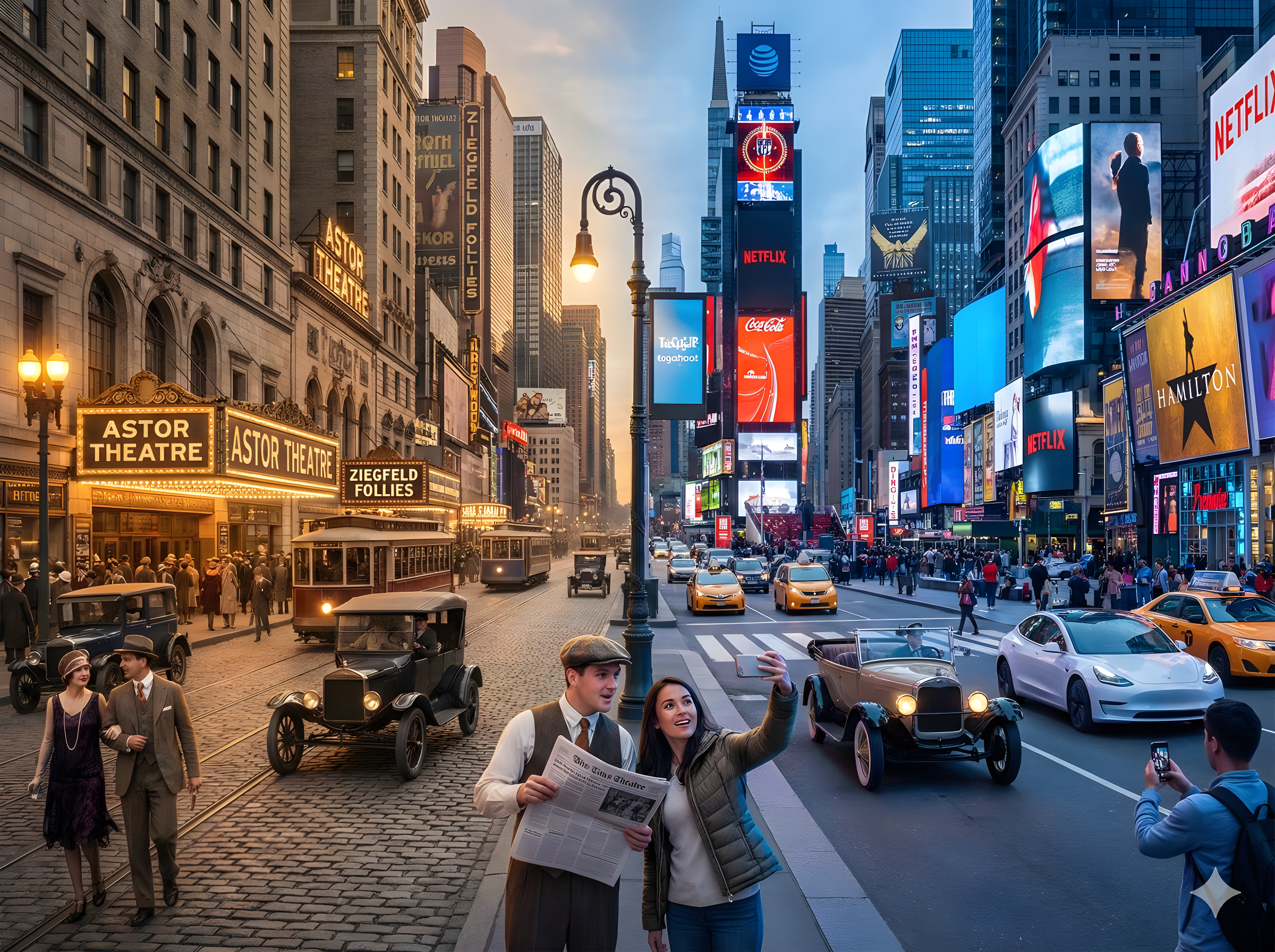 CopyA horizontal split-screen cinematic shot of {Scene}, seamlessly blending two different eras: {Era_A} on the left and {Era_B} on the right (default: about 100 years ago vs. present day). On the left side ({Era_A}): show era-appropriate architecture, interior or environment design, materials, vehicles, and props that clearly belong to that historical period. People wear authentic clothing from {Era_A}, including hairstyles, accessories, and typical items in their hands (such as books, umbrellas, instruments, letters, newspapers, etc.). The overall mood feels nostalgic and historically accurate. On the right side ({Era_B}): show the same {Scene} in the modern era, with updated architecture or renovated structures, contemporary materials (glass, steel, LED screens, modern furniture), modern vehicles or equipment, and current technology (smartphones, laptops, cameras, etc.). People wear contemporary fashion that matches today’s style in this setting. In the center: the two eras merge and overlap organically, without a hard dividing line. Elements from {Era_A} and {Era_B} visually interact: people from different times look at each other, walk through each other’s space, or seem surprised by the other era’s technology and objects. Architecture and environment smoothly morph from old to new (for example, stone gates turning into modern campus gates, classical concert hall décor fading into a futuristic stage, old street shops transforming into neon-lit storefronts). Make sure the scene is not just a simple left/right comparison but a dynamic time-travel interaction where buildings, clothing, props, and human gestures clearly emphasize the contrast and fusion between the two eras. Photorealistic, 8k resolution, cinematic lighting, wide angle, highly detailed textures, rich sense of time-travel storytelling. --- SCENE: Times Square, New York Era Comparison: 1920s and present day Aspect Ratio: 4:3